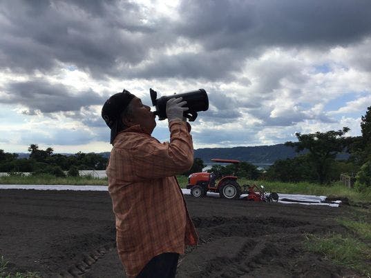 49歳から桜島(鹿児島市)に土地を借り、市街地からフェリーで通って作り始めて14年になります。「火山灰土とマグマの力で育つ自然の恵みを食卓に届けたい」と4千平方メートルの広大な畑で汗を流しています。