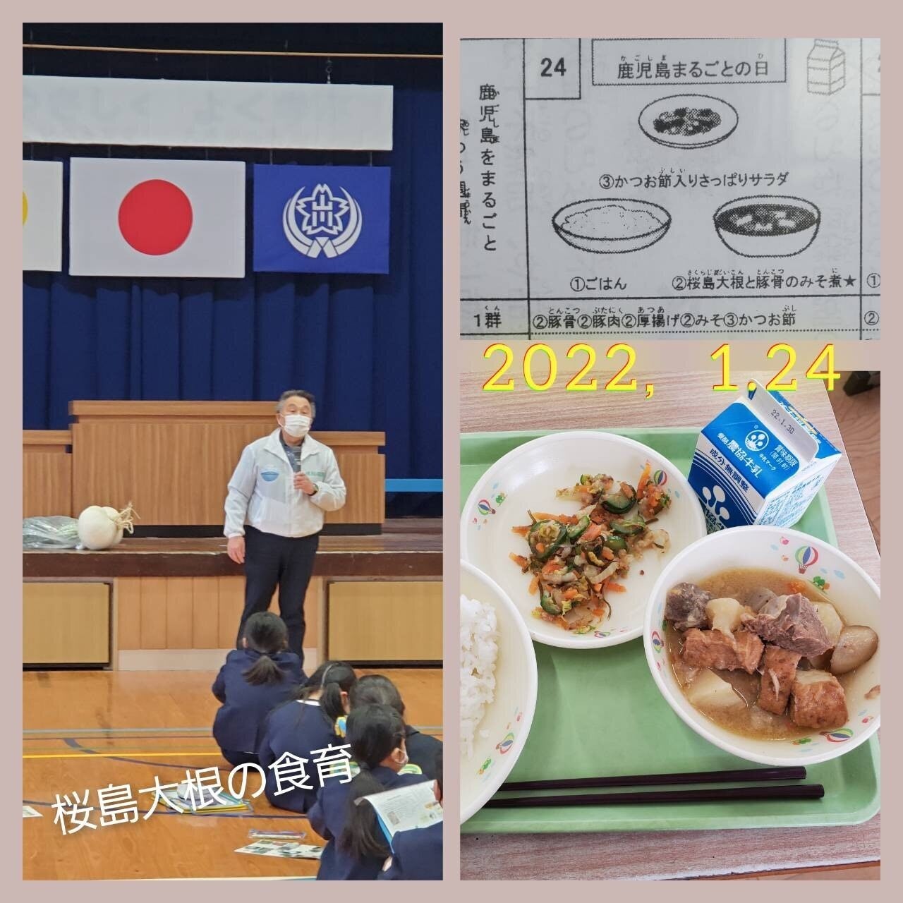 鹿児島県指宿市山川(鰹節で有名)の山川小学校で3年生68名に桜島大根を使った食育授業でした。授業終わった後の給食に猪飼農園の桜島大根が使われてます。