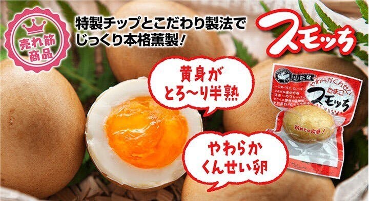 山形名物として10年以上間親しまれている、塩味付きの半熟くんせい卵です。