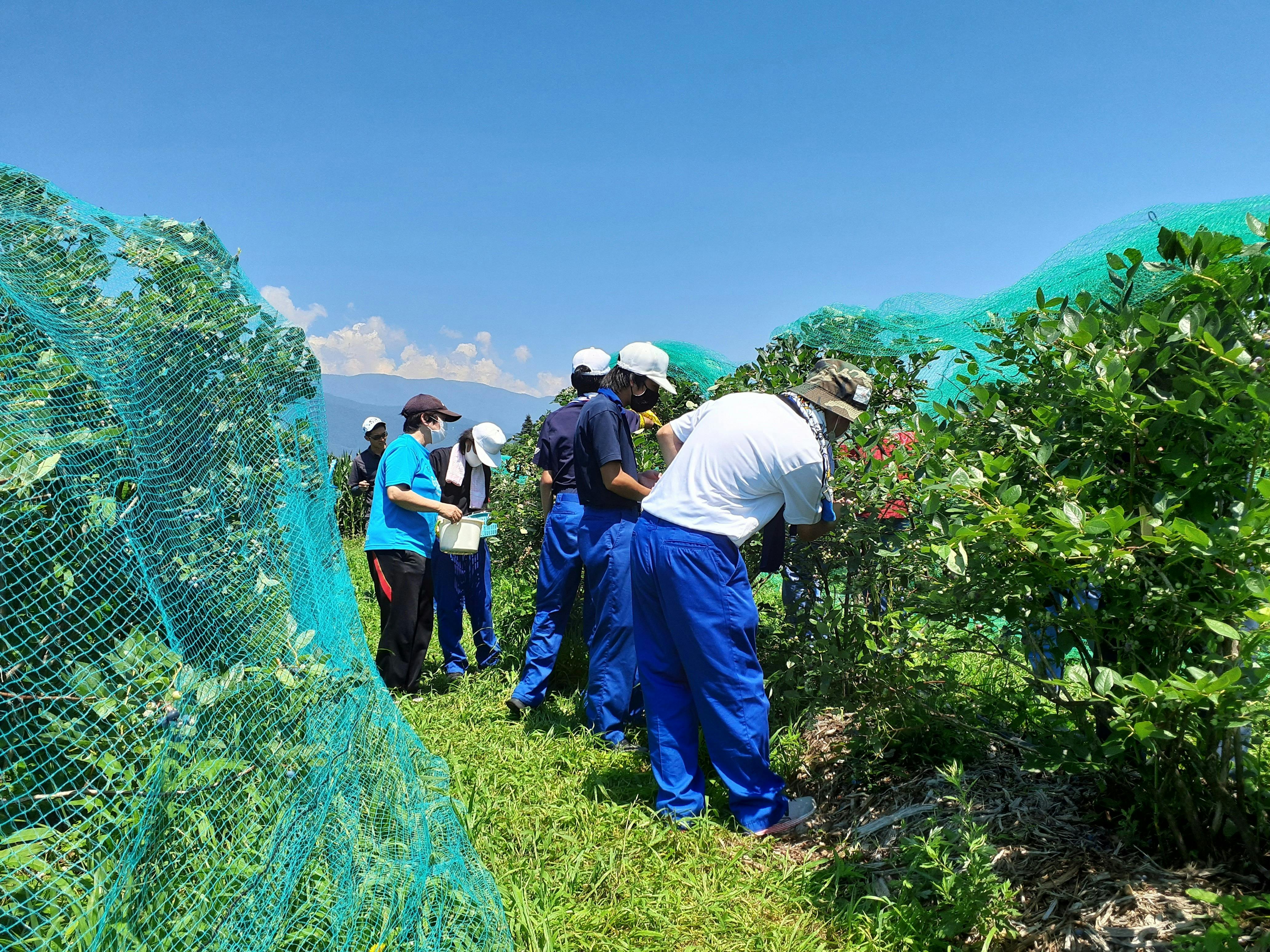 初めてブルーベリーを見る、収穫するという生徒さんが大多数の中で、皆で助け合いながら夢中になって収穫し、帰りのバスの中からにこにこして手を振ってくれた子ども達の笑顔で、私たちも幸せな気持ちになることができました。