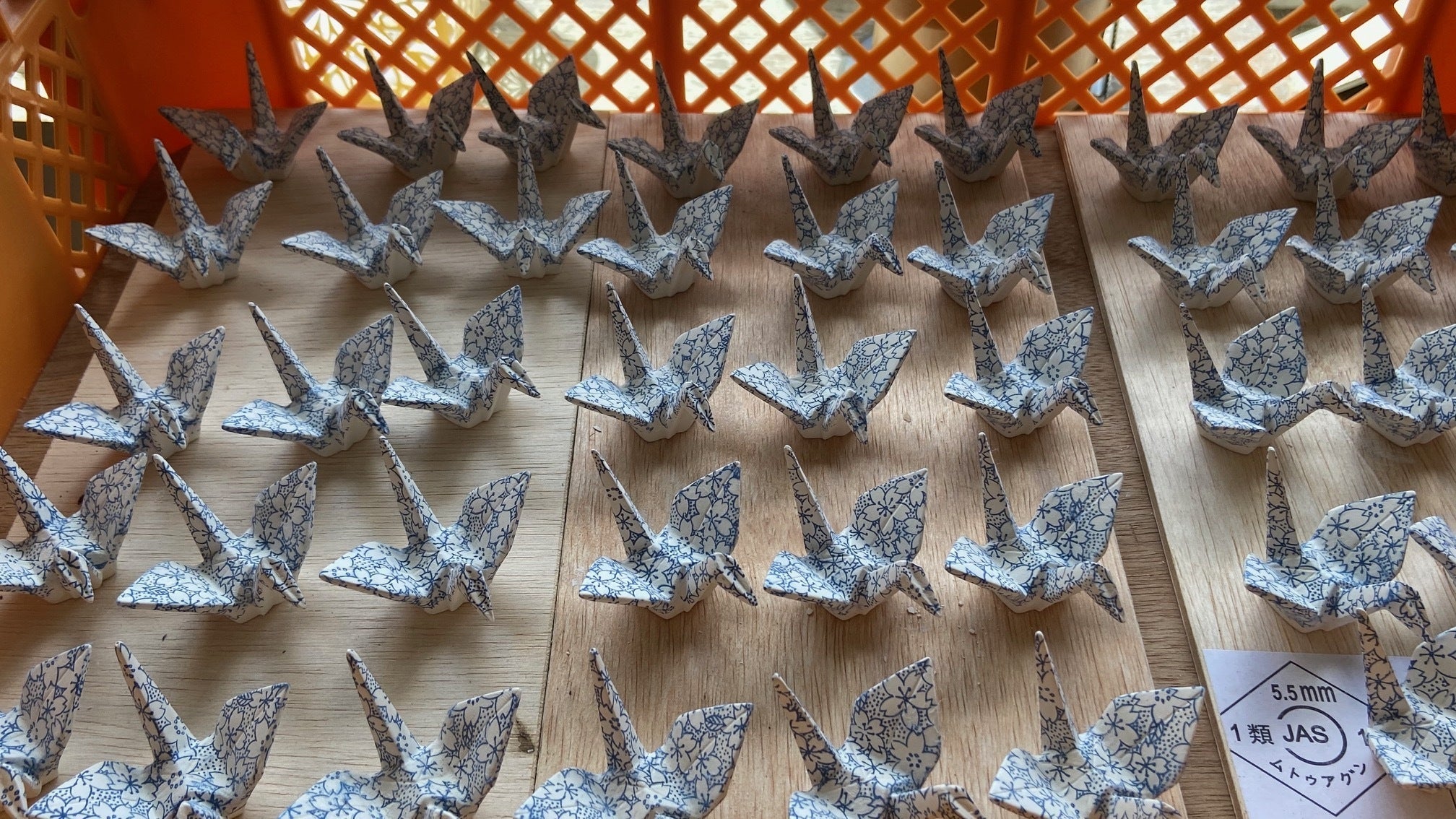 こちらの鶴は職人さんが一つ一つ平和の祈りを込めて絵をつけております。