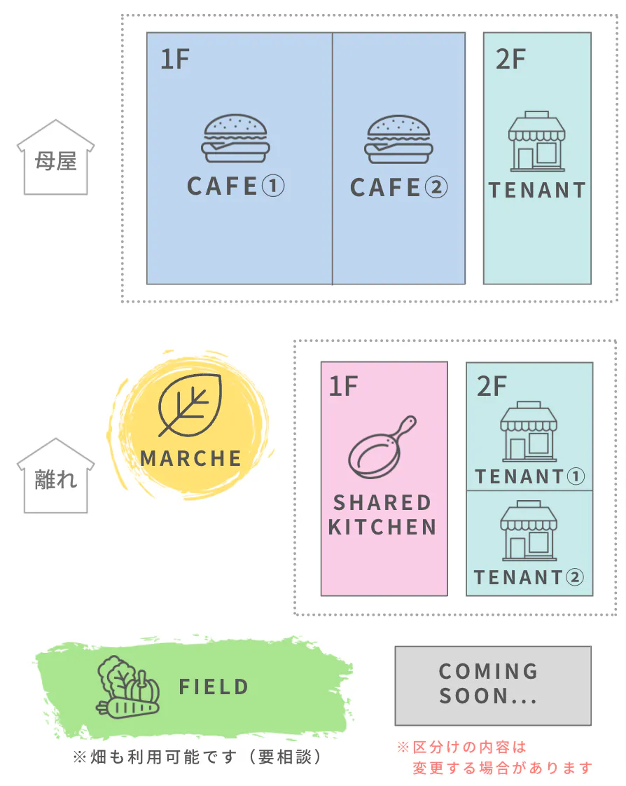 1Fにはメイン店舗となるカフェ、2Fには雑貨店などのテナントなど、2〜4店舗が入居可能です。