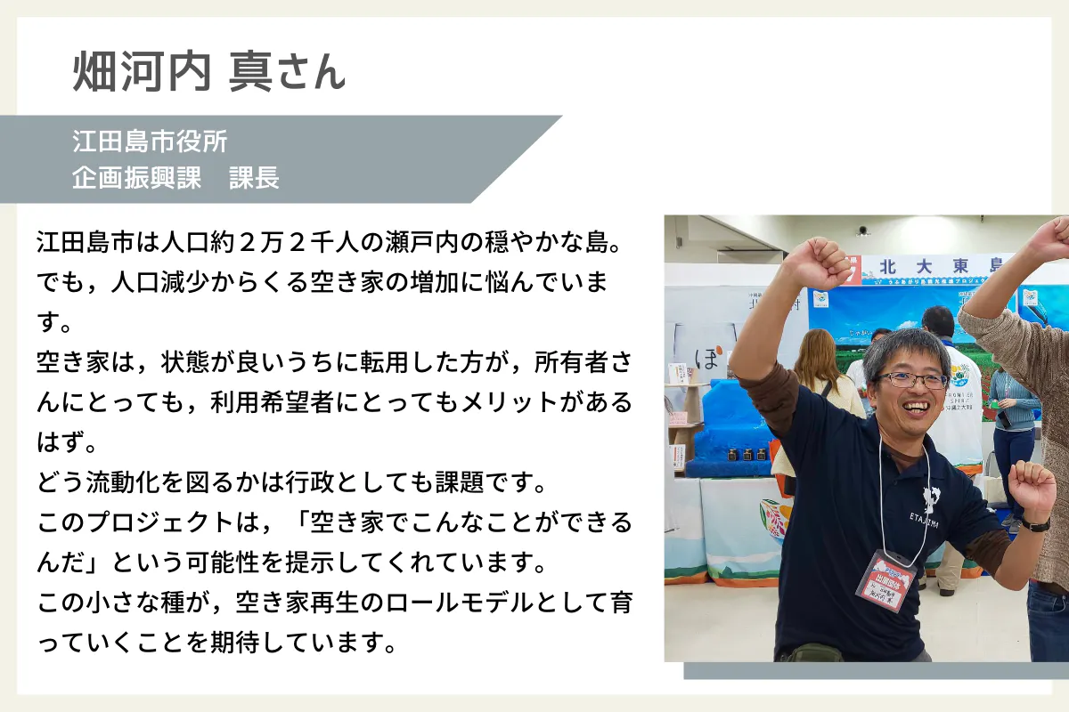 江田島には空き家を基点とした交流スポットがあまりないため、「空き家を基点とした交流」ということも江田島市にとっては新しい価値観となると思っています。