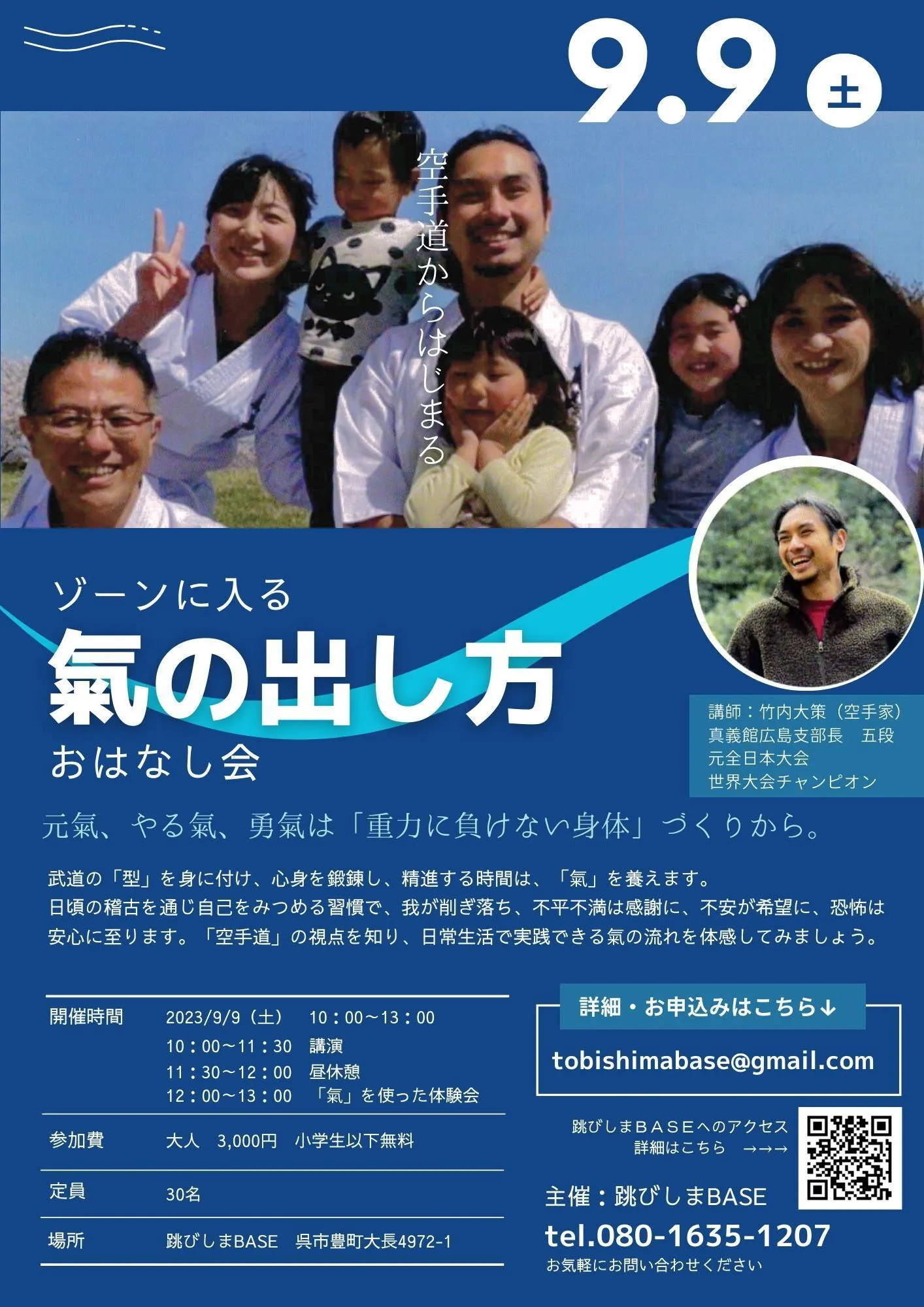 2023/08/22 21:56残暑お見舞い申し上げます。みなさま、こんにちは!とても暑い日が続きますが、いかがお過ごしですか?夏バテしていませんか?とびしまは海に囲まれた島なので、涼しそうなイメージですが、本土と負けないくらい暑さ炸裂です!とはいえ、お盆を過ぎればなんとなく日射しも傾き、季節の変わる気配を感じます。お盆休みでつい張り切って活動的になってしまう時期ですが、8月後半はペースダウンして、身体の疲れをとり、リフレッシュして2023年後半戦をスタートしたいですね!跳びしまBASEでは、本年後半戦の最初に、元気のでる企画をしました!空手家 竹内大策さんのお話会 ↓内容はコチラのリンクよりおはなし会 概要詳細最近空手を始めた友人が、7月に 呉市一華寺で大策さんのお話会を企画しました。「とにかく、凄くイイのよっ!」熱く語る彼女から、お話し会のA4チラシを渡されました。空手? あんまり馴染がないなぁ・・・?でも「氣」は気になる・・・wスケジュールは厳しそうだけど、何とかなるか・・?なんて、正直ま、いってみるか、くらいの気持ちでいました。数日後、たまたま一人旅で「跳びしまBASE」に宿まりに来られた、志和のお寺、報専坊の和尚さんが、大策さんと知り合いだったのです。「きっといいご縁になりますよ」そう言われ、参加する流れとなりました。それが、本当に大正解だったのです。おはなし会は、お寺の畳敷きの間に10数名が集まり、リラックスして 好き勝手にくるま座になって始まりました。しかし、話を聴くうちに2時間後には、背筋をシャンと伸ばし、正座し、目をまん丸に見開きながら一言一句を聞き逃さないよう集中している自分がいました。それだけ真っすぐに話が心に届き、今すぐ「氣」の実践をしたくなるわけです。あっという間の感動的な3時間でした。この頃はインターネットのYou Tubeで、有名な講師の動画を手軽に観られるようになりました。しかし、実際に会うより勝ることはありません。特に「氣」に関しては、目に見えないものを目で交わしたり、力を入れずに力をだしたり、少しのワークを通じて体験できることがあります。小さなきっかけが日常の意識を大きく変えてくれる可能性を持っています。そこで、できるだけ多くの方に聴いて欲しくて、跳びしまBASEでも開催して頂くことになりました。「氣」を纏い、「氣」を出すことがなぜ大切なのか?健康に幸せに生きるために「氣」を意識することが、大きな助けになります。空手道を極め、今も研鑽を続ける大策さんが、試合で全力をだせた体験談。そこから得られた人生の極意を、空手の体感ワークをしながら聞かせてもらえる会です。大策さんの語りの面白さに、ぐいぐい引き込まれる3時間です。何かの「道」を学ばれている方スポーツをされている方子育て中の方体調や心のバランスを整えたい方宇宙と調和して生きたい方そんな方々にお届けしたいと思います。お時間が許す方は、是非とびしまへ足を運んでみてくださいね。跳びしまBASE 柳澤 もっと見る