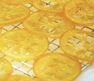レモンを輪切りにして砂糖で煮詰め、チョコをかけたお菓子です。