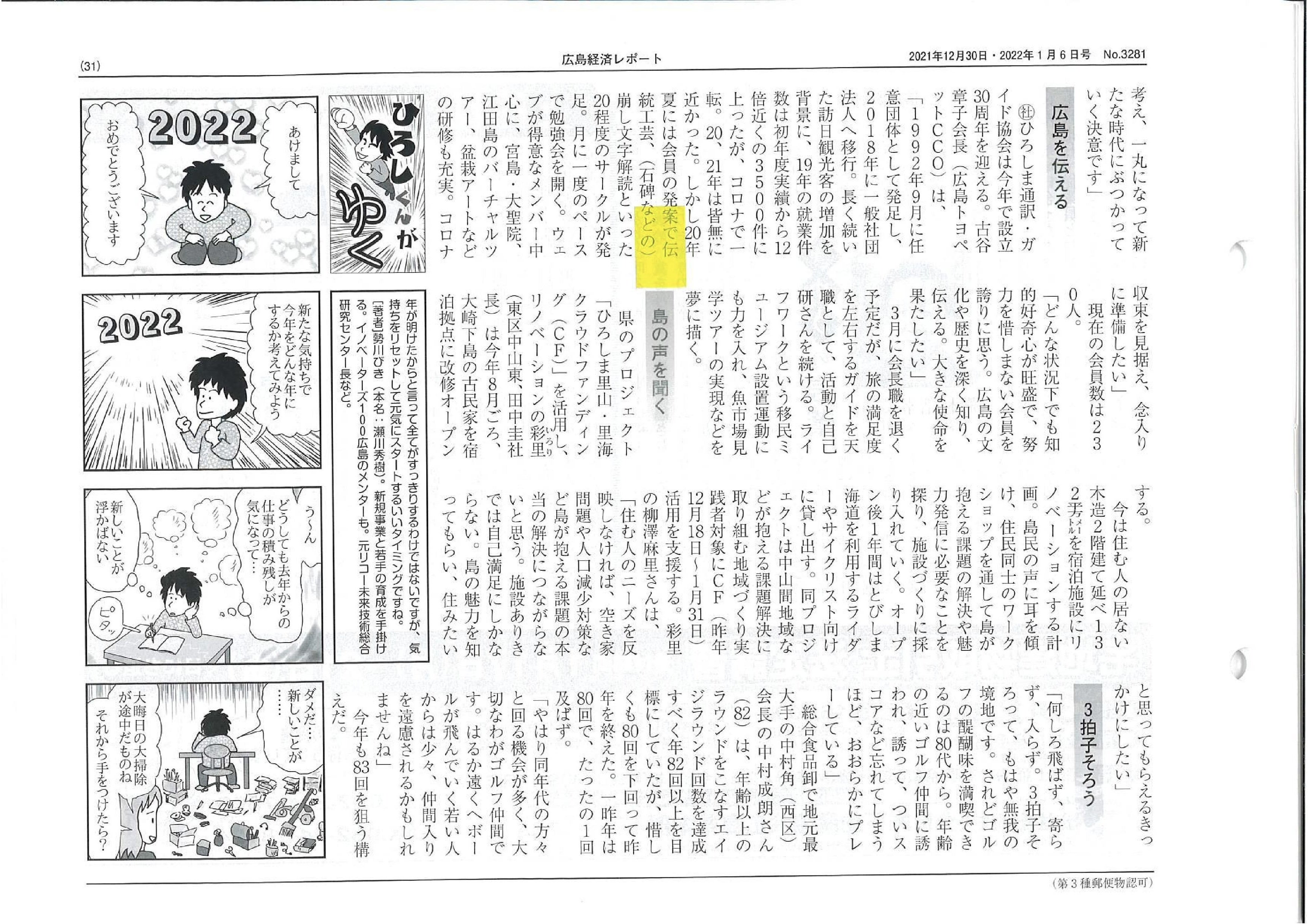 本日は以前取材をして頂いた、広島経済レポートの新春号に当プロジェクトの記事をご紹介頂きました。