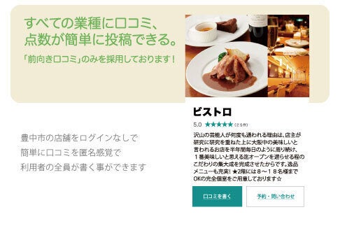 豊中市の店舗をログインなしで、ユーザー全員が簡単に口コミを書くことができます。評価数が多くなるので、店選びの参考になります。