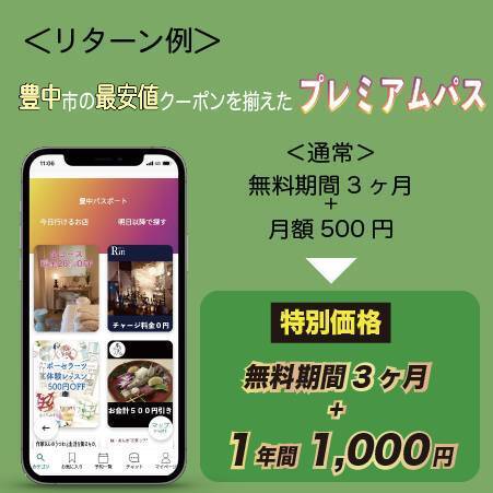 2021/12/16 09:00大阪府豊中市のあらゆる情報を一つにまとめたアプリ「豊中CiPPo」。このアプリを使えば、欲しい情報にタイムリーに出会え、日々の生活がもっと楽しく、快適に過ごせるようになります。多くの皆様に活用していただき、豊中市の活性化に貢献したいと思っています!リターン例【プレミアムパス1年間1000円】本来月額500円の豊中の最安クーポンが使える豊中CiPPoアプリのプレミアムパスを1年間利用できます。初回3ヶ月の無料期間を入れると15ヶ月1000円で利用することができます!■プレミアムクーポン例■・お食事の際にドリンク1杯無料・ランチ10%OFF・1000円以上購入で次回利用できる割引チケット進呈など もっと見る