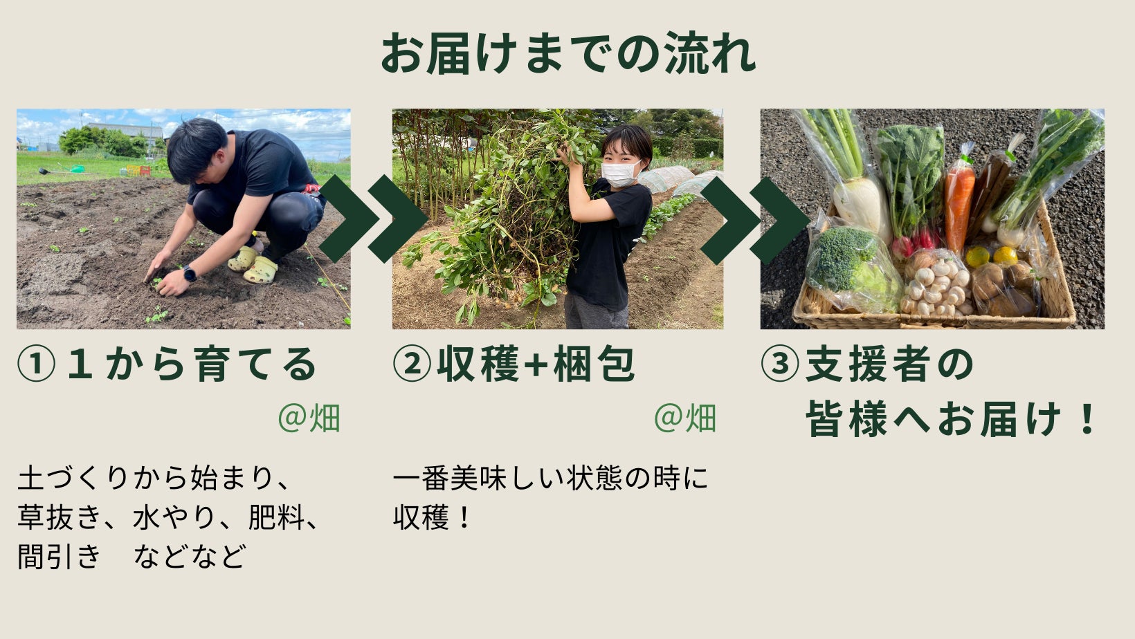 さらに周りの農家さんの規格外野菜も私たちが東京の消費者に届けることで「生産者と消費者をつなげる」役割を担うことができるのではないかと考えました。安心安全で生産者の顔が見えるお野菜を今回のリターン品(お野菜ボックス)にお入れいたします!