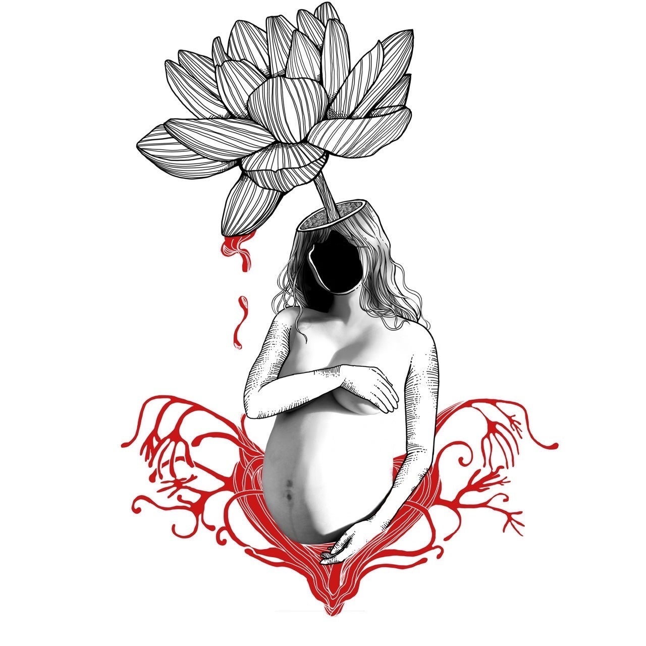 写真集に使用する写真に、私が出産する時に見た蓮の花を描き、そこから滴る血で満たされた私をイメージしたデザインとなっています。
