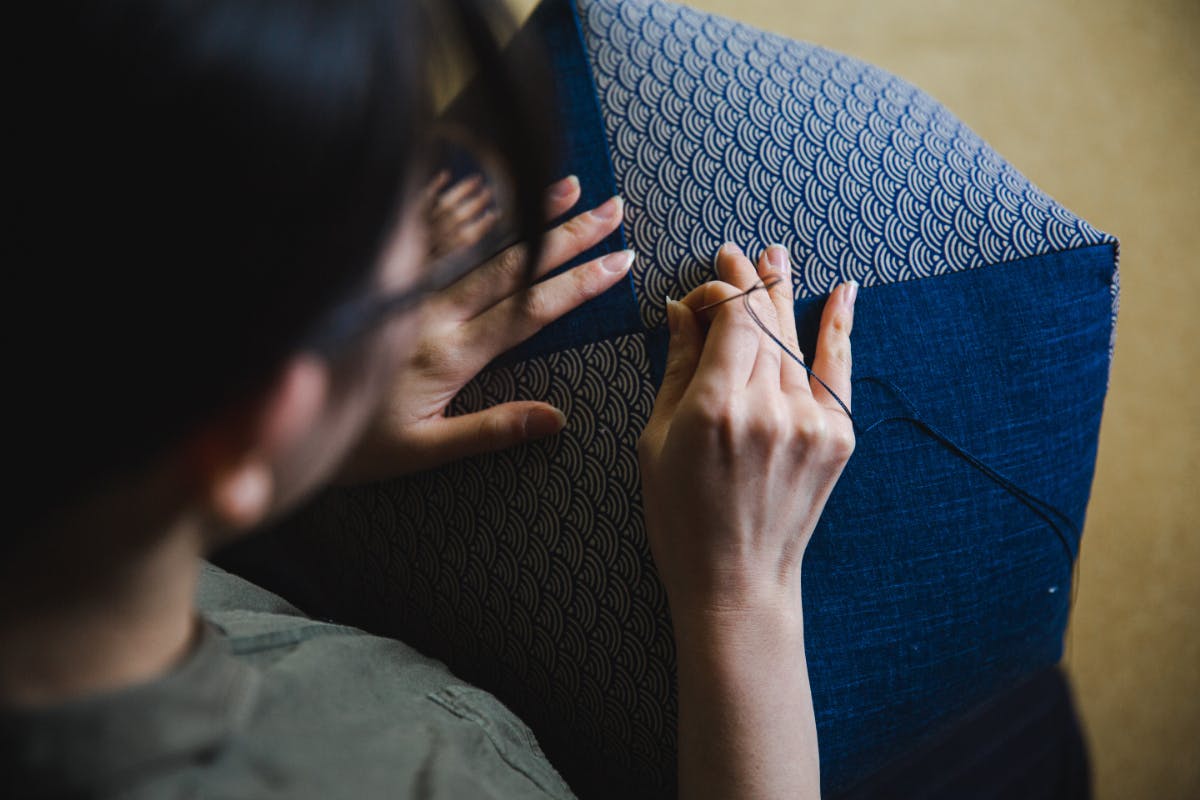 わた入れ口を手縫いで絎け(くけ)ます。絎けとは縫い目が表に出ないように生地を縫い合わせる手法のことです。