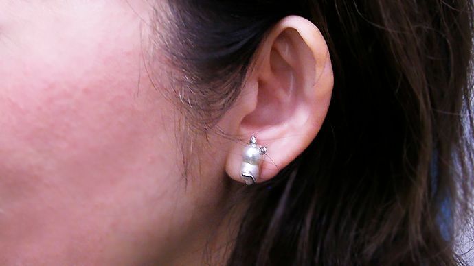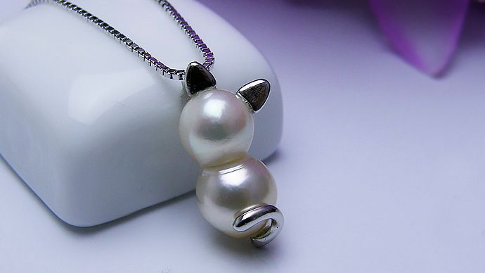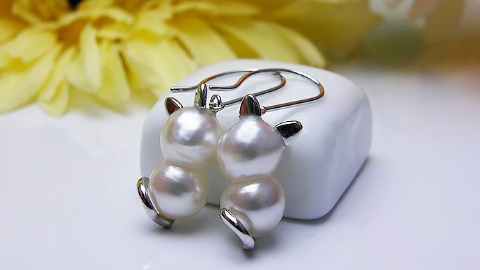 あこや双子真珠 幅 約7ミリ 長さ約13~14ミリ 、猫のパーツはSV製です。