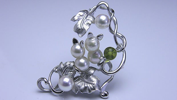 あこや双子真珠、あこや真珠無調色、グリーンアンバー ブローチ枠 SV製