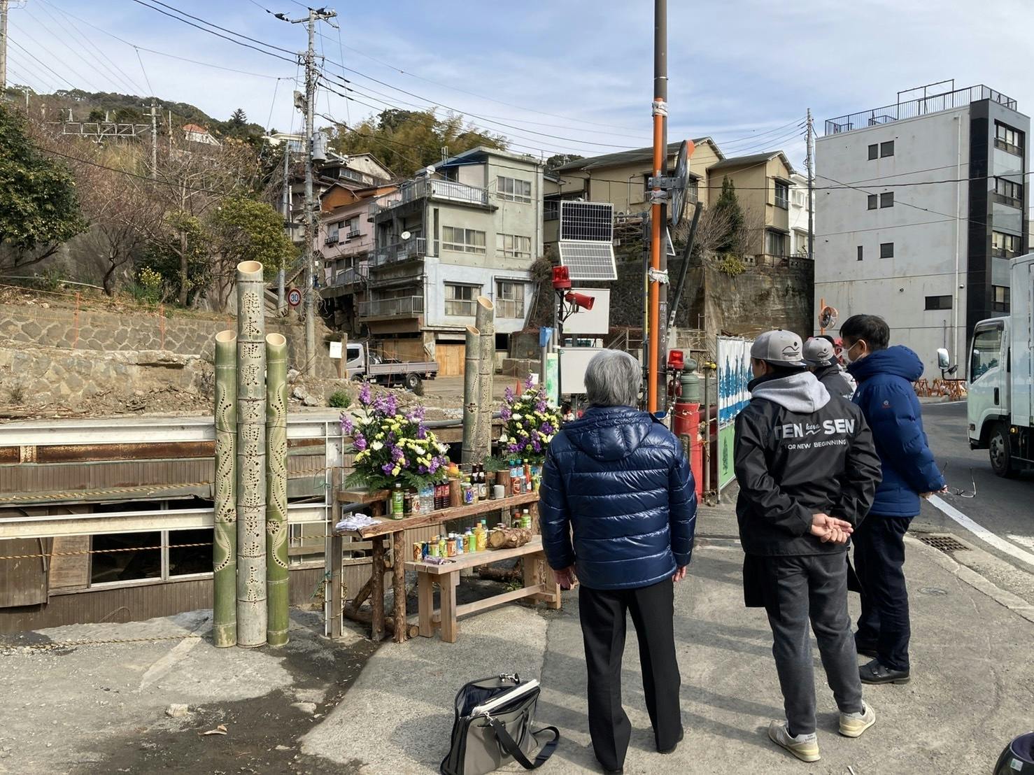 献花台は、森林保全団体の熱海キコリーズが間伐材のヒノキを使って制作してくれたもの。その両脇には、大晦日に伊豆山神社で開催したイベント「伊豆山に灯りを」のために熊本県から届いた立派な竹灯籠を磨き直して設置しています。献花台を設置してから、たくさんの方が立ち寄り手を合わせてくださる場所になりました。