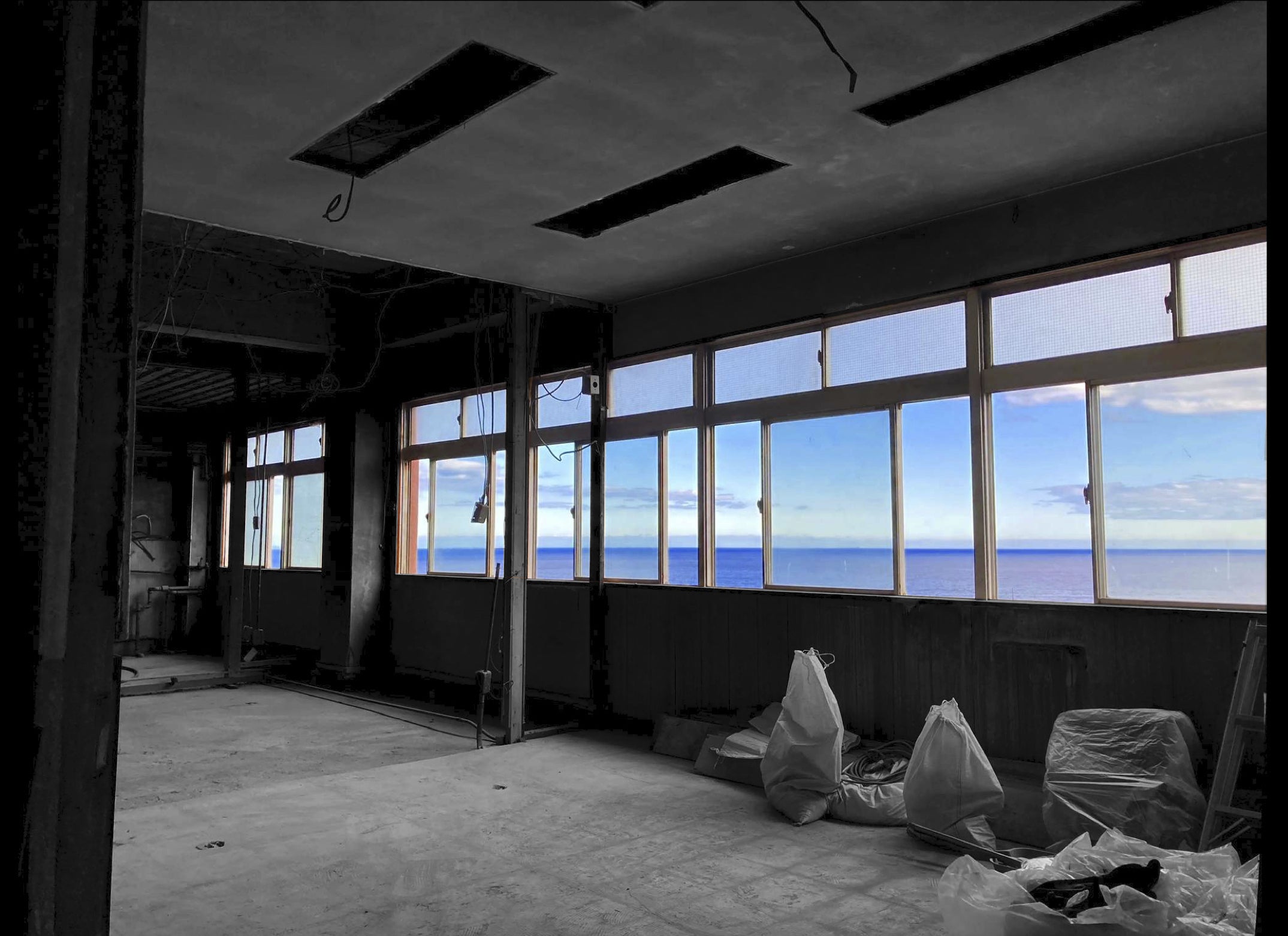 水平線が広がる窓際はカウンター席に。そして、小上がりたたみ席に物販スペースまで! また、当初は目標額以上の資金が集まった場合に予定していた多機能トイレですが、どうしても導入したいという思いから設置を決めました。