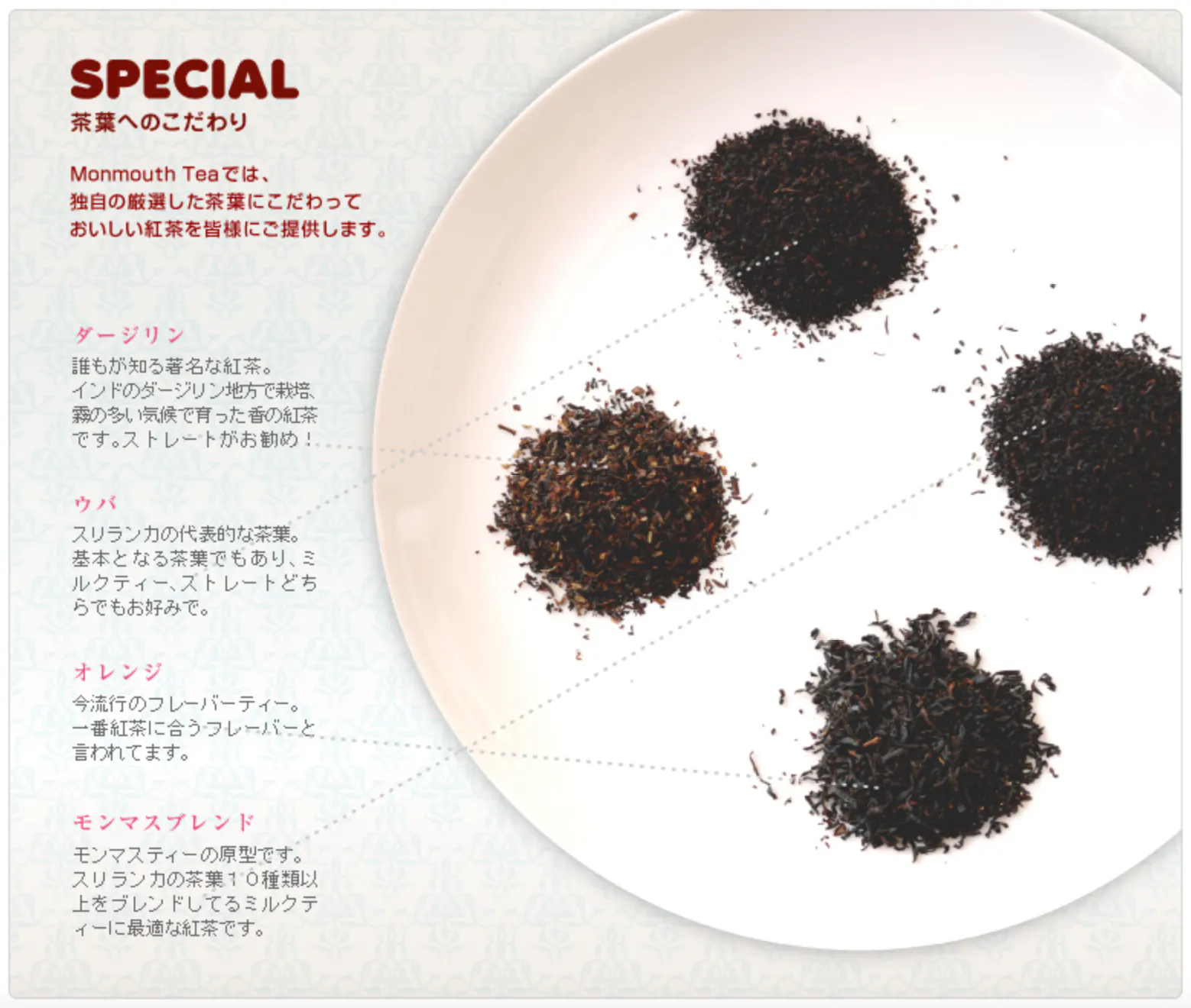ふつうの紅茶専門店のミルクティーは香りと色に重きを置いたものが多く、茶葉はアールグレイを使うのが主流ですが、「モンマスティー」ではスリランカの茶葉をブレンドしたものを使用しており、味わい深く、バラのフレグランスが香り立つのが特徴的です。