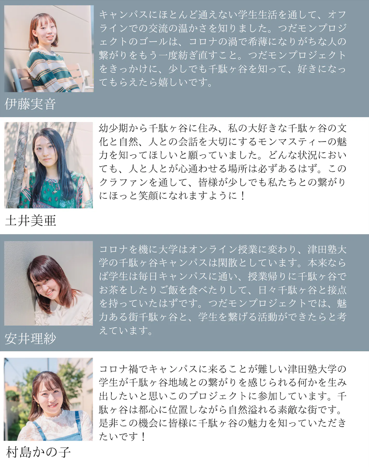 つだモンプロジェクトは、2021年6月に立ち上がり、コロナ禍における大学生活の現状を変えたいという思いで活動に全力を尽くしてきました。そして、私たちはモンマスティーの皆様、千駄ヶ谷の皆様のお力添えのもと、SNS発信だけでなく、どこにいてもモンマスティーや千駄ヶ谷、津田塾大学の魅力を感じられるモノ、千駄ヶ谷の街に来るきっかけとなるようなプロダクトを作ろうと決意しました。