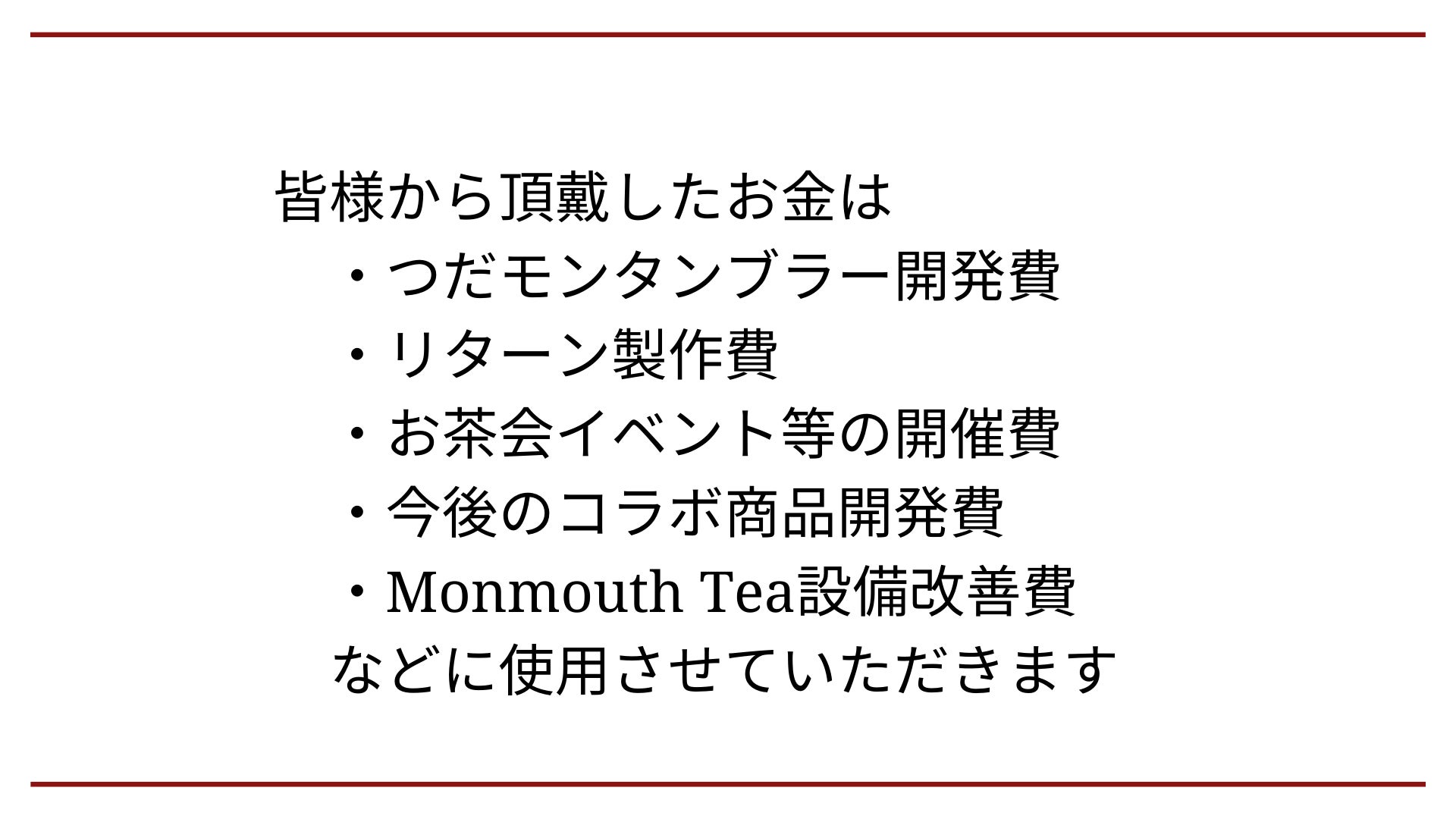 2021/12/01 10:32プロジェクトを応援してくださった皆様へ。11月1日から始まった、私たち「つだモンプロジェクト」のクラウドファンディングへの挑戦は遂に幕を閉じました。最終日までに143名の方にご支援をいただき、目標金額であった300,000円を大きく達成して最終金額は681,000円(達成率227%)となりました。本当に沢山の応援をありがとうございました。皆様にお届けするリターン品の発送準備は、今月中旬より随時行ってまいります。リターン品の到着まで今しばらくお待ちください。また、全てのリターン品の発送・到着は2022年1月に完了する予定ですが、万が一遅れが発生する際は個別にご連絡させていただきます。皆様のご理解とご協力をよろしくお願いいたします。また、クラウドファンディングは終了しましたが、引き続き下記ページにて活動報告を更新いたします。もし何かプロジェクトについてご不明点等ありましたら、いつでも対応いたしますので個人メッセージなどをご活用ください。ーーーーーーーーーーーーーーーーーーーーーーーーーーーーーーーーーーー千駄ヶ谷の紅茶屋さん、「モンマスティー」から学生と地域の輪を広げたい!https://camp-fire.jp/projects/view/507988ーーーーーーーーーーーーーーーーーーーーーーーーーーーーーーーーーーー最後になりましたが、今回のクラウドファンディングを通じて、私たち「つだモンプロジェクト」を応援してくださった全ての皆様に改めて、心より感謝申し上げます。ご自身のSNS等を通じて幅広くお声がけしていただいた支援者様、ウェブサイト等に活動を掲載してくださった皆様、クラウドファンディングを行うにあたりアドバイスをしてくださった皆様、撮影などにご協力いただいた地域・学生の皆様、本当にありがとうございました。そして何よりも、私たち学生の思いに共感してくださり、プロジェクトを後押ししてくださった「モンマスティー」関係者の皆様に厚く御礼申し上げます。クラウドファンディングへの挑戦は今回が最後となりますが、「つだモンプロジェクト」の発信活動やコラボイベント等はリターン品の発送完了まで継続して参りますので、引き続き皆様の温かいご声援をよろしくお願いいたします。千駄ヶ谷の憩いの場「モンマスティー」で皆様とお会いできることを願っております。つだモンプロジェクト一同ーーーーーーーーーーーーーーーーーーーーーーーーーーーーーーーーーーー【モンマスティー店舗情報】店舗名:モンマスティー千駄ヶ谷店住所:〒150-0051 東京都渋谷区千駄ヶ谷1-21-2営業時間:月~日曜日 7:00~24:00定休日:無休電話番号:03-3478-2357お店のHP:http://www.monmouth.jp/index.html【つだモンプロジェクト】公式HP:https://tsudamon2021.wixsite.com/websiteInstagram:https://www.instagram.com/tsudamon_project/ーーーーーーーーーーーーーーーーーーーーーーーーーーーーーーーーーーー もっと見る