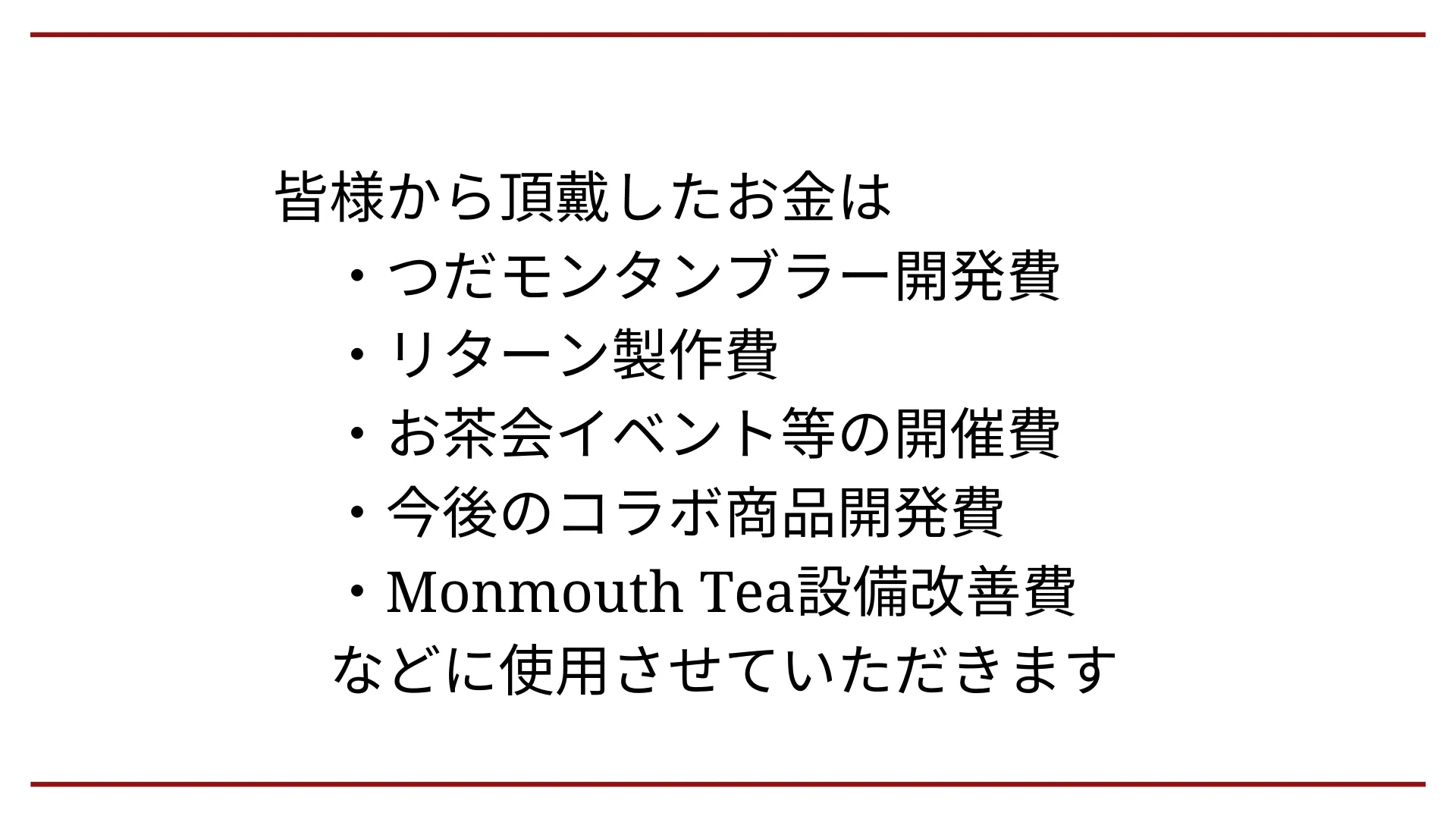 今回のクラウドファンディングを通して、私たちの大好きな千駄ヶ谷とモンマスティーの魅力をより多くの人に伝えていきたいと思います。皆様のご支援・ご声援を、どうぞよろしくお願いいたします。