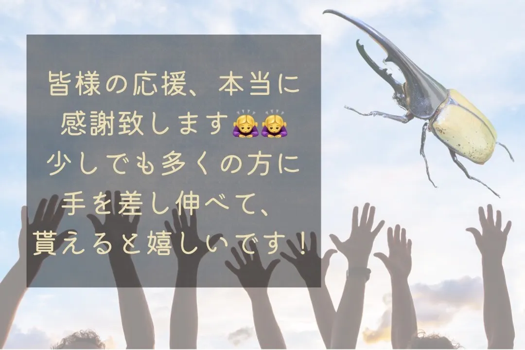 2021/12/01 16:37皆様、こんにちは。株式会社fairview代表の高橋です。クラウドファンディングに挑戦を初めてから、2週間が経過しました。現在の支援者数22名、支援総額213,000円、達成率30%です!数々のご支援、本当にありがとうございます!!繁殖状況ですが、現在の幼虫の数が106匹になりました!徐々に幼虫も大きくなっております!寒い冬を乗り越えて、成虫になる姿を早くみたいですね!毎週報告させて頂きますので、引き続き、宜しくお願いします! もっと見る