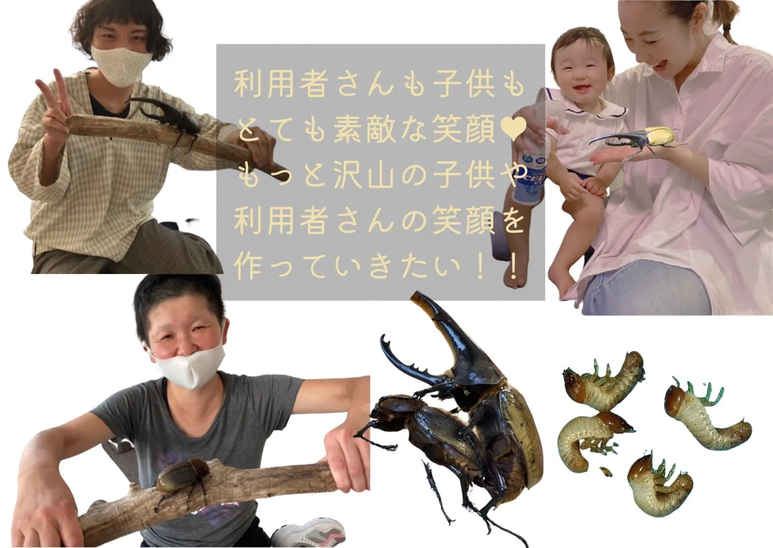 子供たちの憧れであるヘラクレスオオカブトが通所している利用者さんの笑顔はもちろん、地域の子供達が集まり、笑顔で溢れる事業所にしたいです。