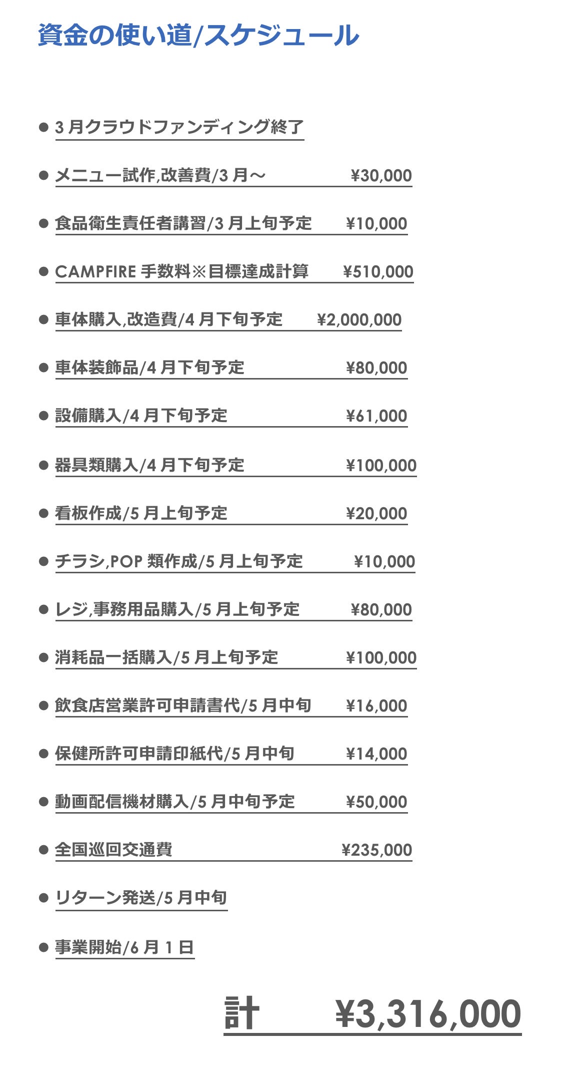 今回のプロジェクトでキッチンカー事業を開始するのが目標ではありますが、支援してくださった方々へのリターンも踏まえて、「現在どこで販売しているか」「あとどれぐらいで自分の住んでいる地域に来るか」などがリアルタイムでわかるように定期的に動画配信をしていきます♫