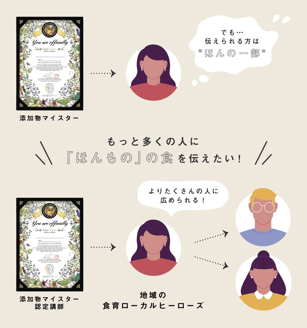 そして、あらためて日本ならではの”ほんもの”の食にも触れていただくなど、ご自身の味覚や価値観を広げていただける機会をたくさん作り、愛のある作り手さんとも繋がり、ご自身はもちろん、大切な人を守れるため知識や知恵となるように、想いを込めて創った資格です。