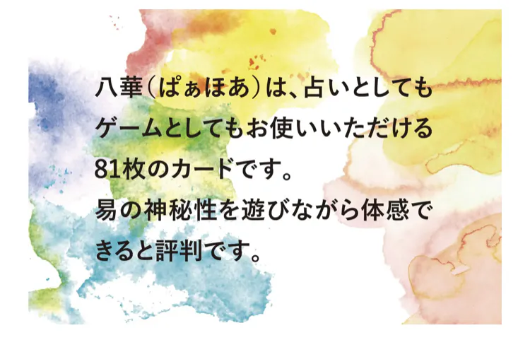 No.10、ボードゲーム【すごろく編】/No.9、ババ抜きゲームとリットリンク/No.8、占い方と「お約束」/No.7、老師より・八華の名の由来/No.6、風の話/No.5、相談者さまの声・絵ではなくマークにした理由/No.4、東京ケイ子先生より応援をいただきました/No.3、鳳美先生からのお便り/No.2、岩崎様、松田様、和田様をご紹介します/No.1、動画に登場ナックル井上様をご紹介します