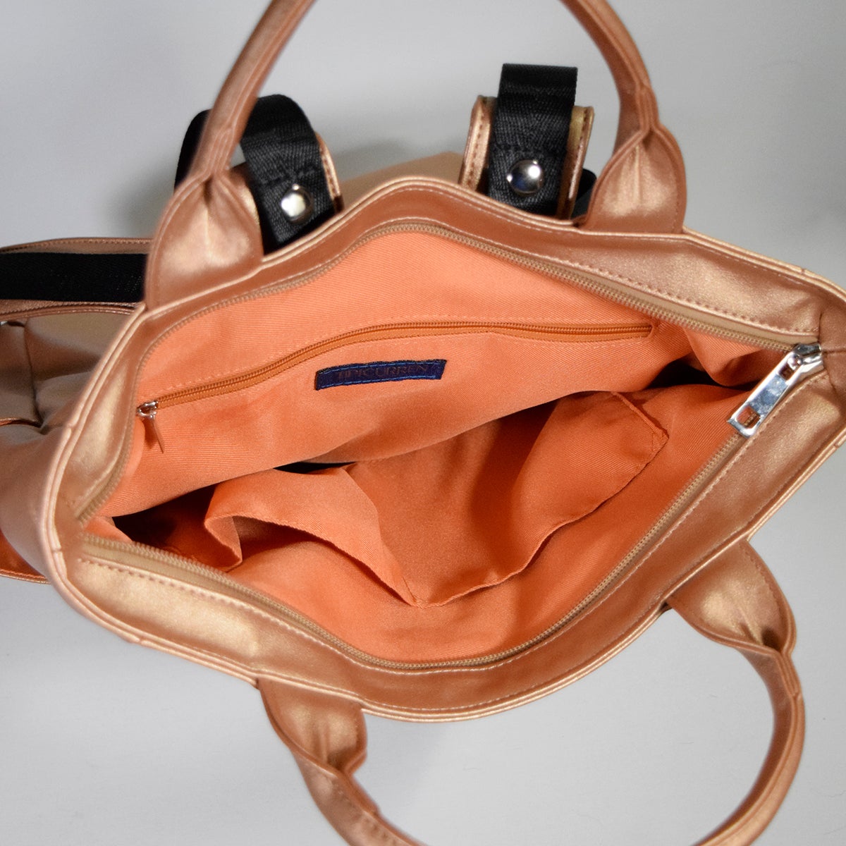中はオレンジのポリエステルにファスナーポケット、切ポケット付き。