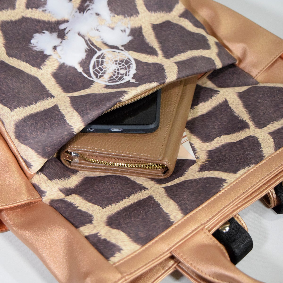 なんにでも合わせやすいメタリック加工のピンクゴールドの合皮の優しいカラーに、ポリエステルのダブルスエード生地にジラフプリントをプラス
