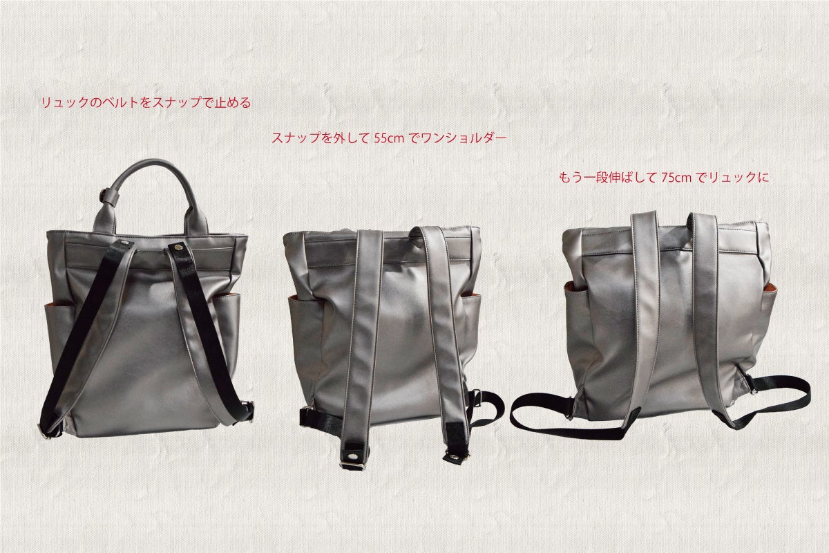 A4サイズが余裕で入るサイズでリュックのベルトはスナップでスッキリ収納すれば、縦長トートが基本形です。