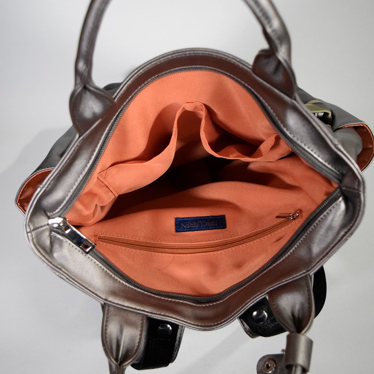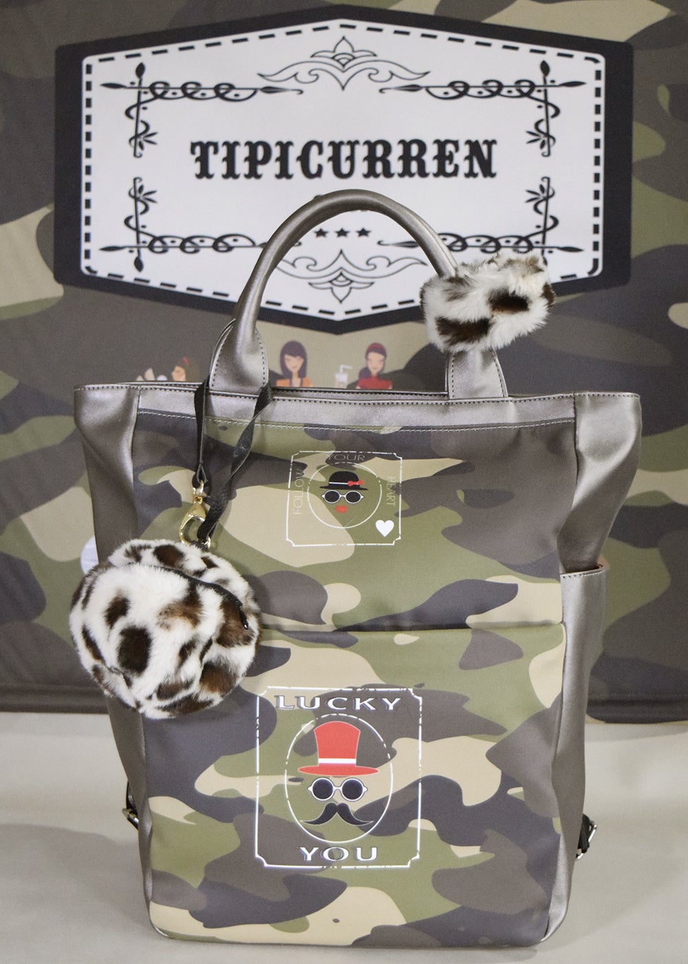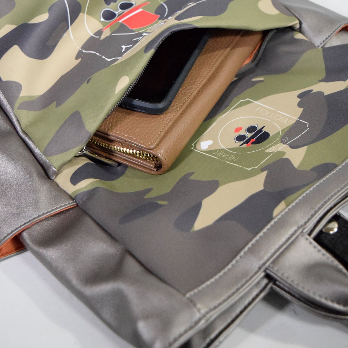 なんにでも合わせやすい合成皮革のメタリックなガンメタカラーに、ポリエステルのダブルスエード生地にカモフラージュプリントをプラス。