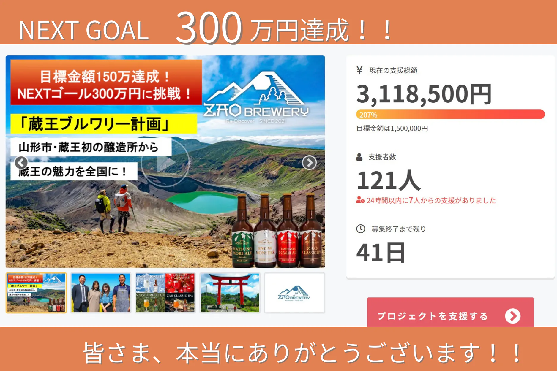 11月12日より開始した蔵王ブルワリークラウドファンディングですが、開始から、なんと1週間でNEXTゴールの300万円も突破することができました!