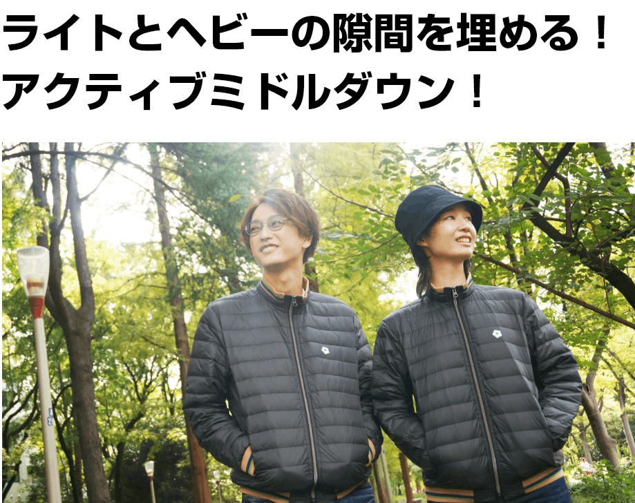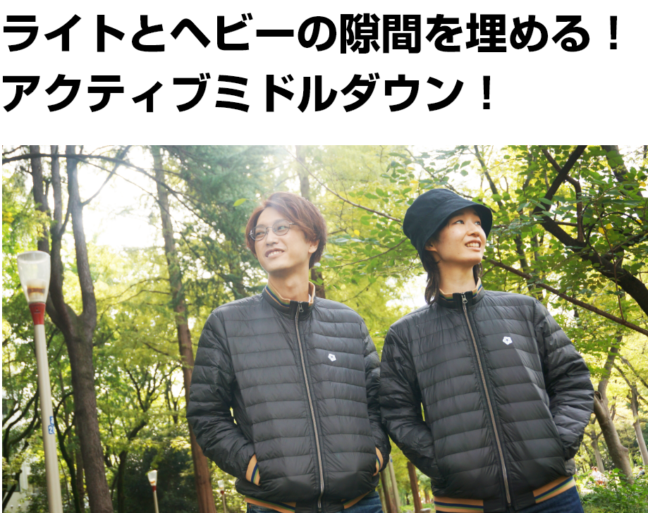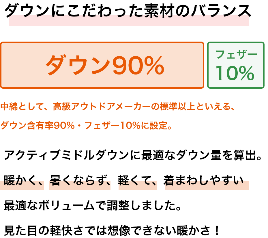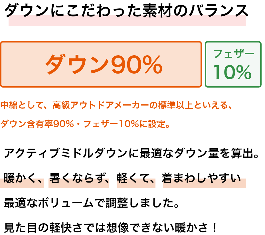 アクティブミドルダウンに最適な、素材バランスとダウン量で最適化しました。
