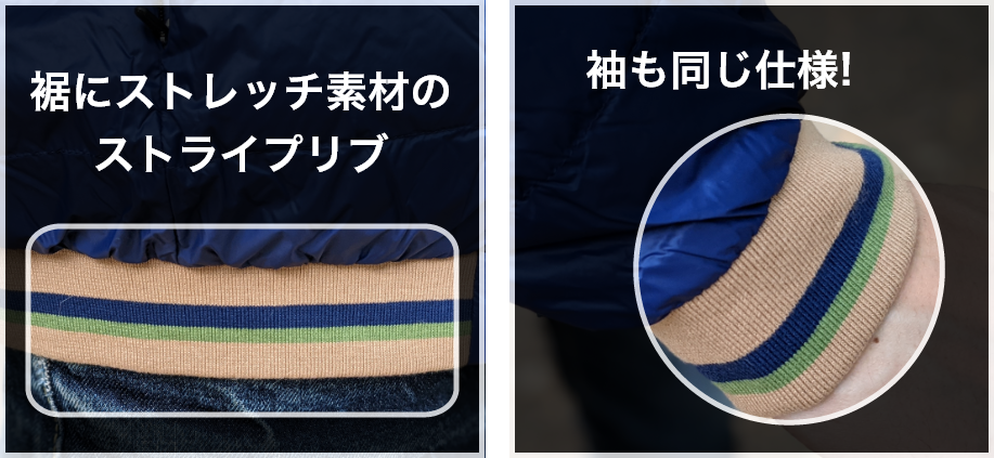 袖と、裾には機能性と着たときの安定感を重視し、伸縮性のあるゴムステッチ仕様に。スタジャンの流れを意識し、ストライプ柄のデザインによってアクティブ感を演出しております。