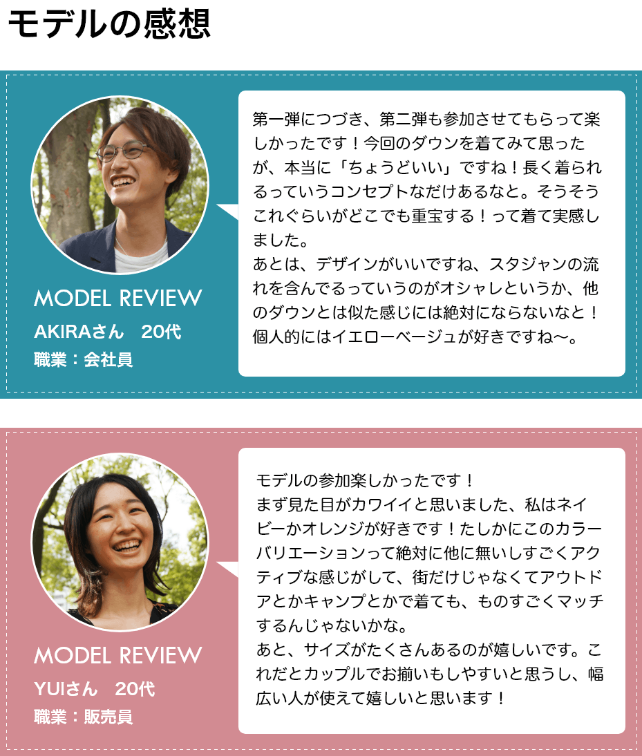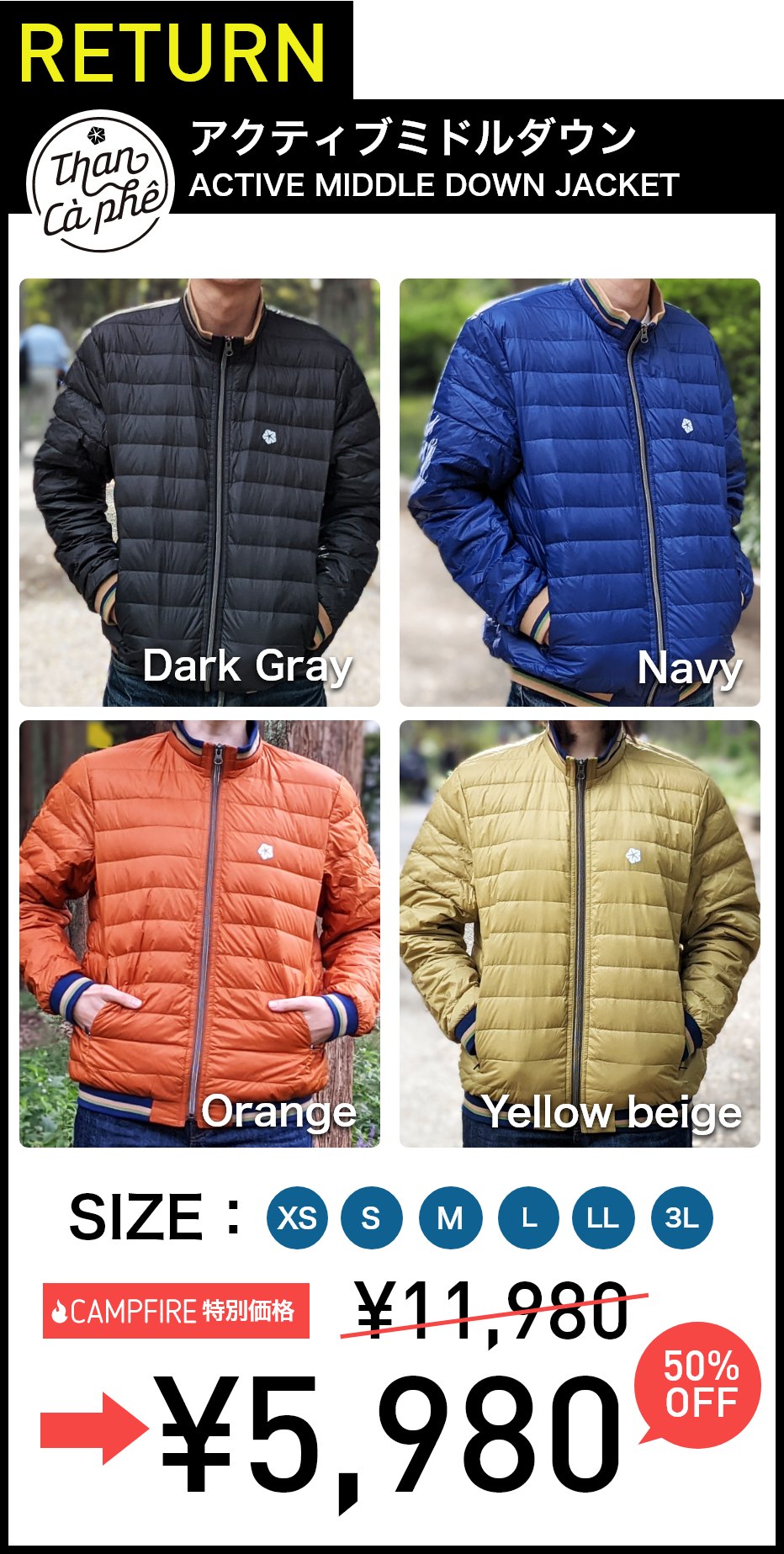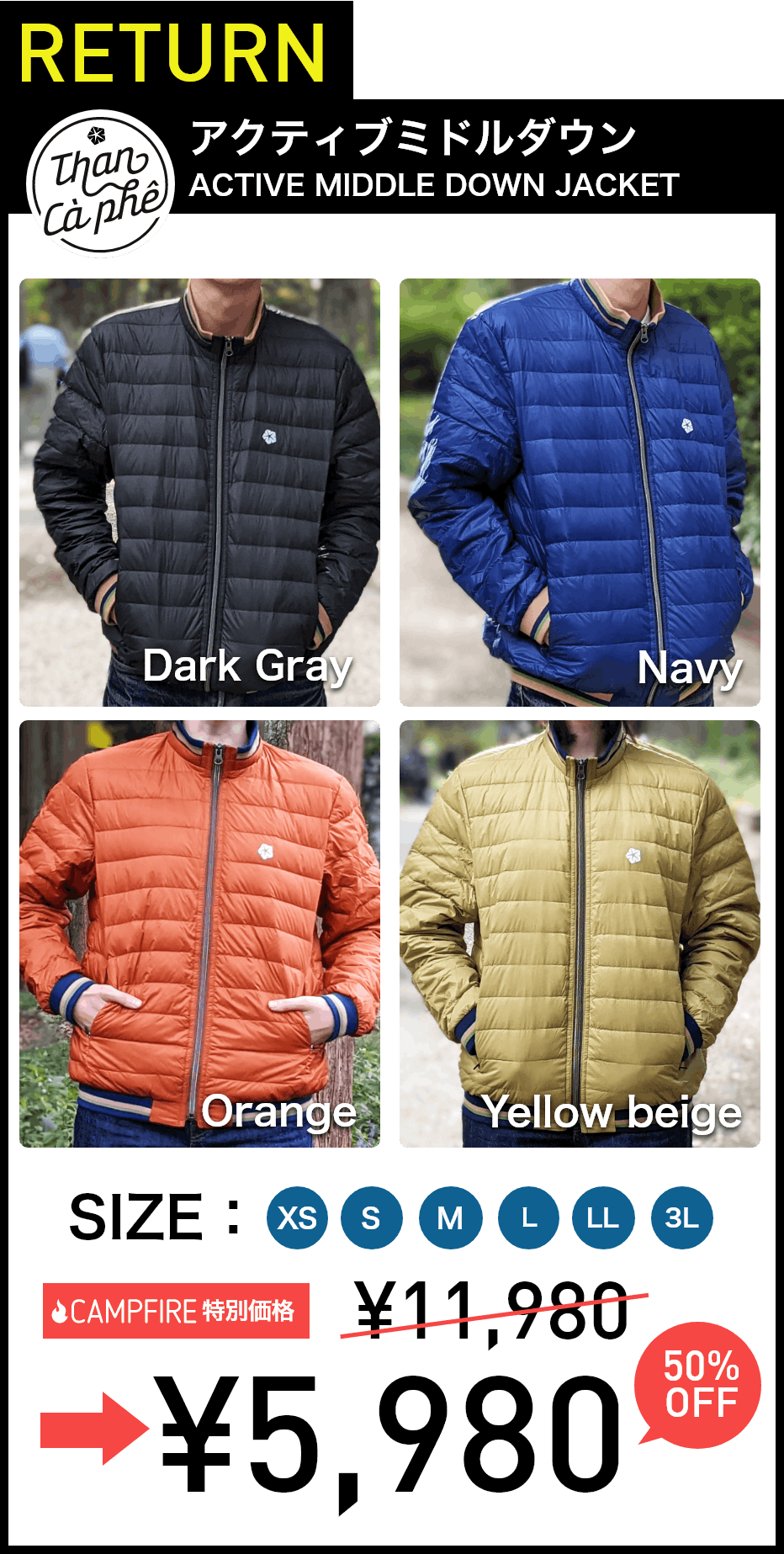 私たちは縫製のプロです。特にダウンに関してはメイン商材として長きに渡り取り扱ってきました。たくさんの人に喜んで頂くためにも、社を上げて本気で取り組み作り上げました。是非一枚、当社のダウンジャケットにご支援のほどよろしくお願いいたします。