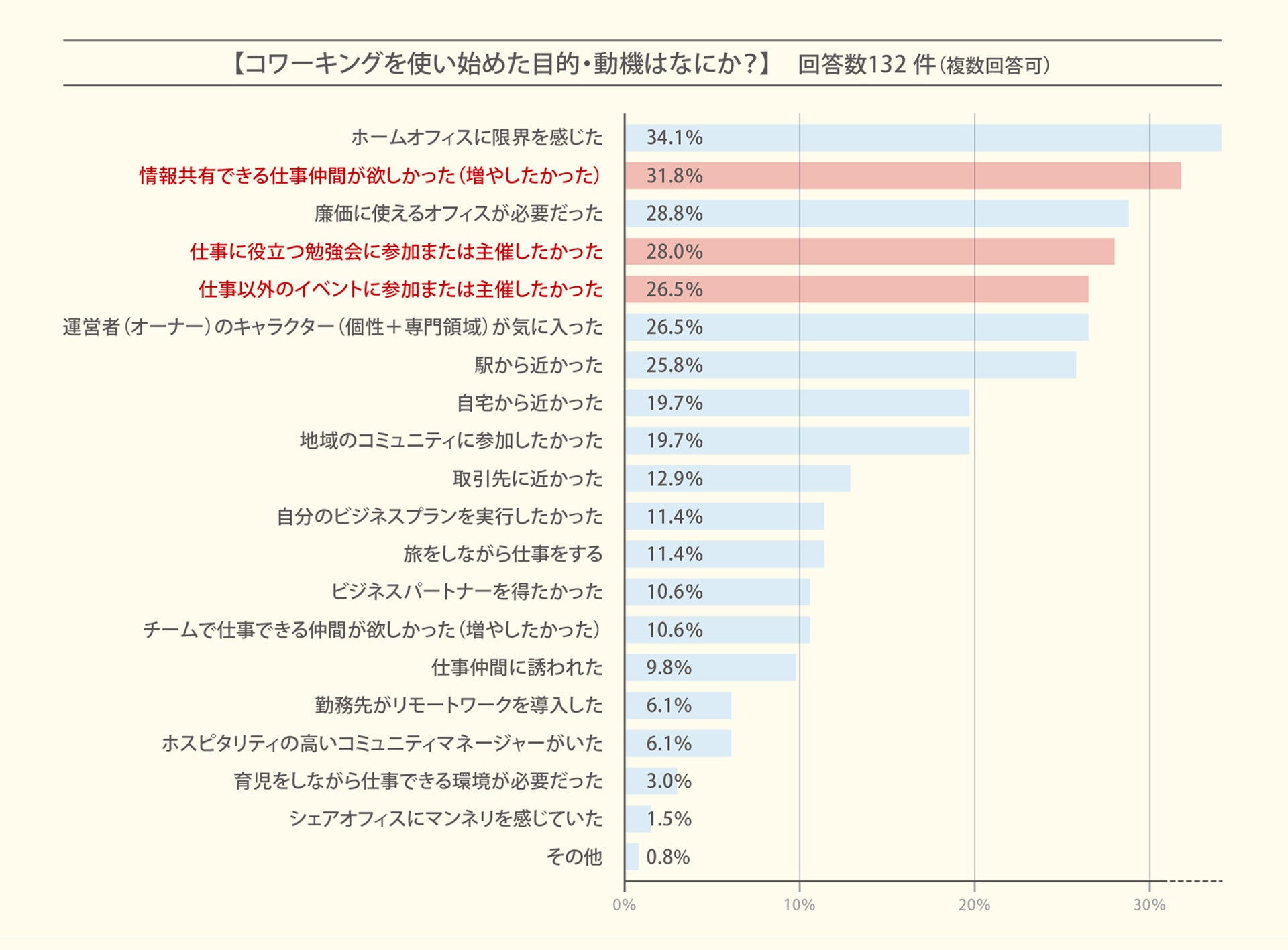 コワーキング協同組合による、コワーキングの利用者と運営者のそれぞれを対象に実施された「コワーキングスペースアンケート調査」の「コワーキングを使い始めた目的・動機はなにか?」という質問では、「情報共有できる仲間がほしかった(増やしたかった)」が31.8%、「仕事に役立つ勉強会に参加または主催したかった」が28%、「仕事以外のイベントに参加または主催したかった」が26.5%と、いずれも人との接点、交流を求めていることを示しています。