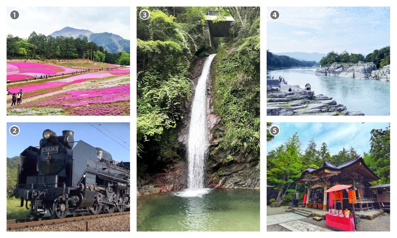 1.羊山公園 2.秩父鉄道SLパレオエクスプレス 3.秩父華厳の滝 4.長瀞岩畳 5.宝登山神社 (2、4,5はUPDRAFTから徒歩圏内。車を使えば気軽に行ける秩父エリアの観光名所はまだまだあります!)
