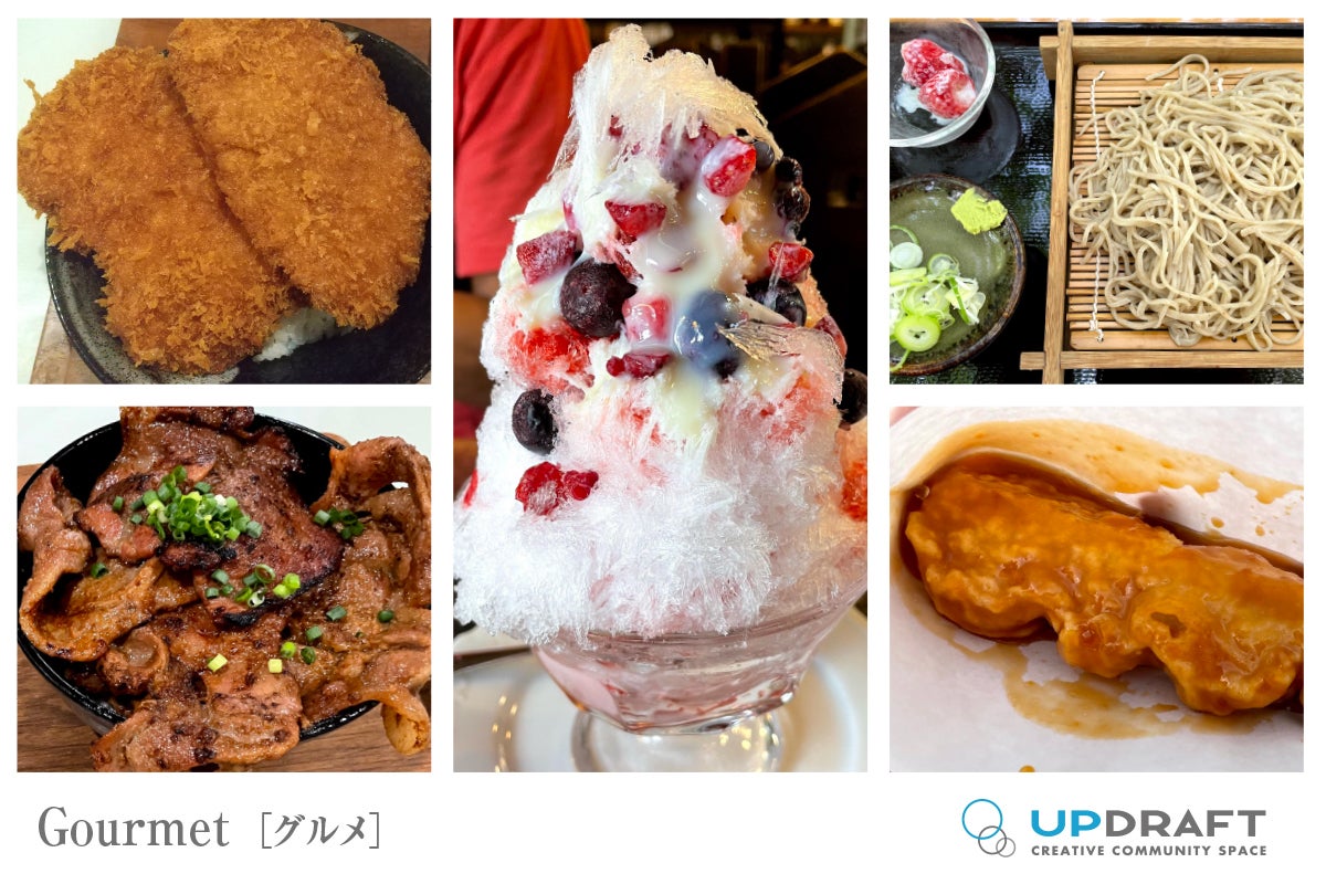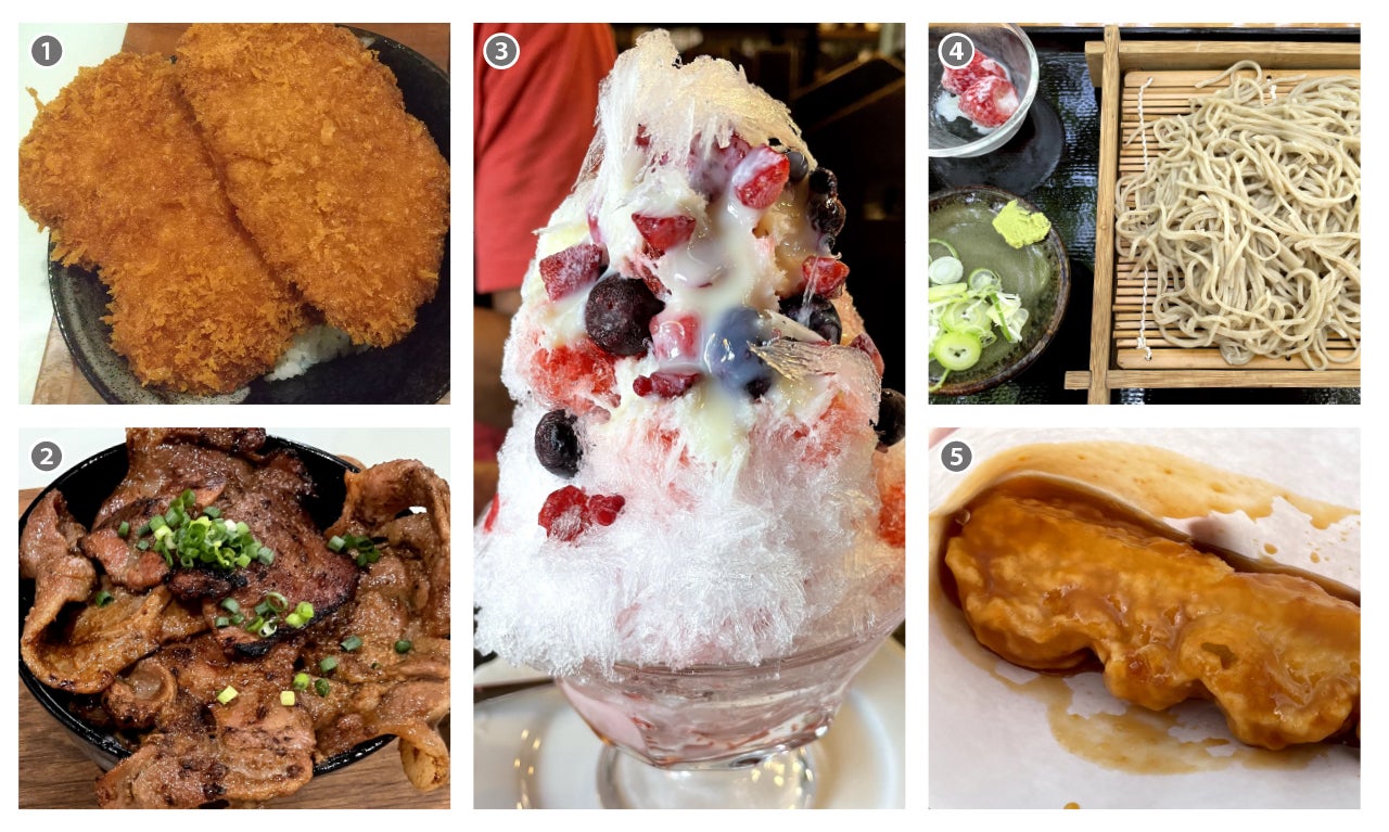 1.わらじかつ丼 2.豚みそ丼 3.天然氷のかき氷 4.蕎麦 5.みそポテト (このほかにも、鮎飯、みそおでん、秩父産メープルシロップやくるみを使ったスイーツなど、秩父グルメは多数あります!いちごやぶどうなどの果樹園も多いので四季折々のフルーツも楽しめます!)