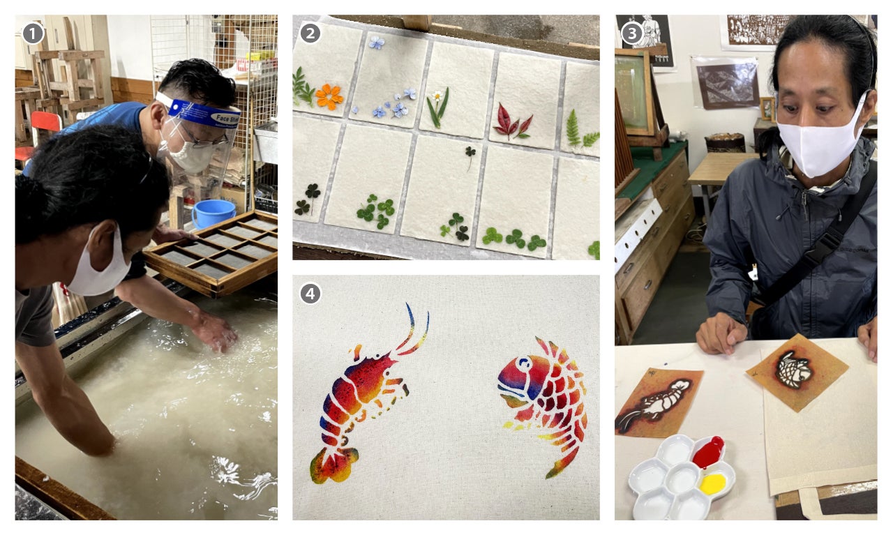 1,2「紙漉き体験」 3,4「秩父銘仙型染め体験」