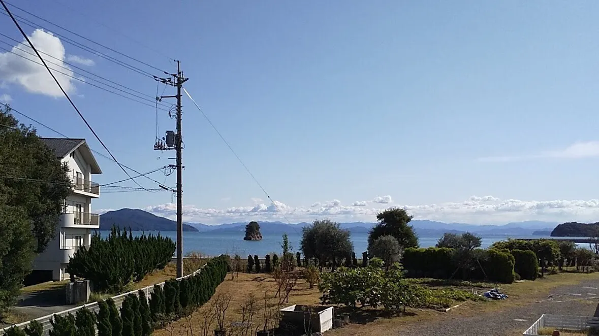徒歩30秒の海の景色。ポツリと浮かぶ小さな島はその名も小豆(あずき)島。