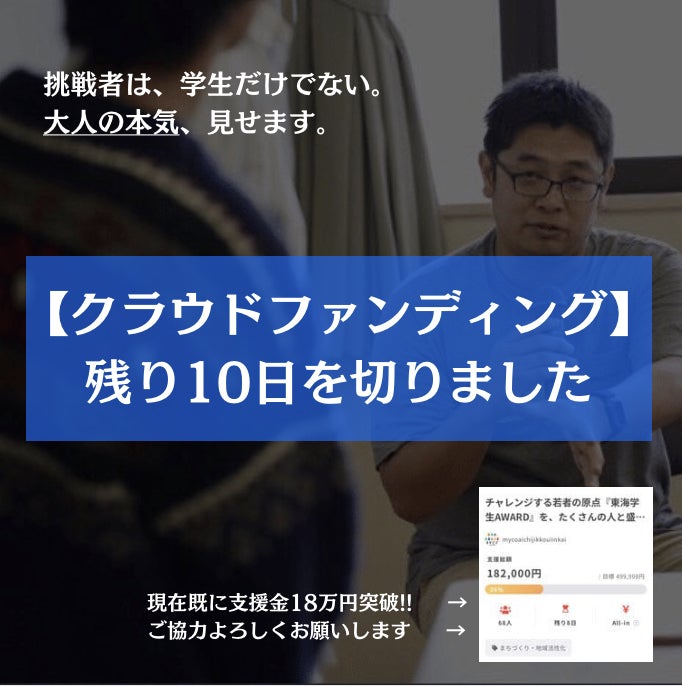 みなさんこんにちは! 本プロジェクトも残すところ、あと10日を切ったことを機に、ご報告と改めてご挨拶させて頂きます!!現在、支援総額は182,000円、支援者数は68人となっています。本当にありがとうございます!!残り少ない日数で、目標まで高い壁を乗り越えていく必要がありますが、皆様からの暖かいお言葉やご支援を力に、達成へ向けてまだまだ走っていきます!!