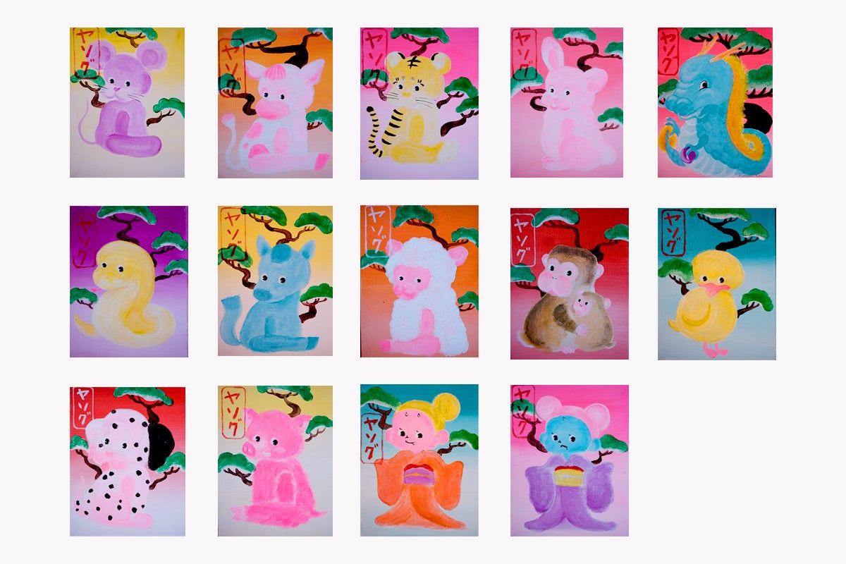 レトロポップ調の干支シリーズです。背景は大衆演劇の舞台をイメージしました。「ヤング」の文字入りはステンドグラス補完計画だけの、オリジナル作品です。