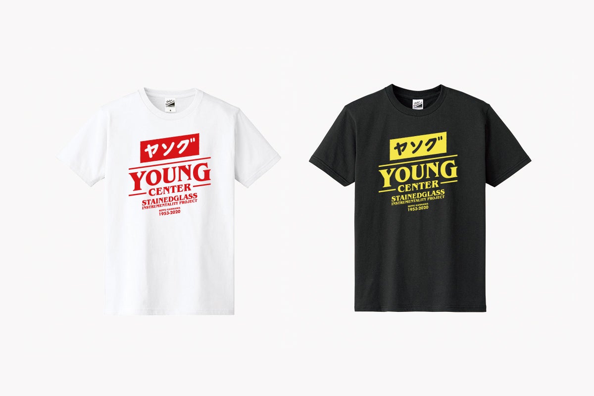 「ヤングセンターステンドグラス補完計画」のロゴと「ヤング」のロゴ(別府のデザイナー有延明乘氏による協力)を合体させた今回のプロジェクト限定のオリジナルTシャツ。黒はM/L/XLサイズのみで限定35枚。