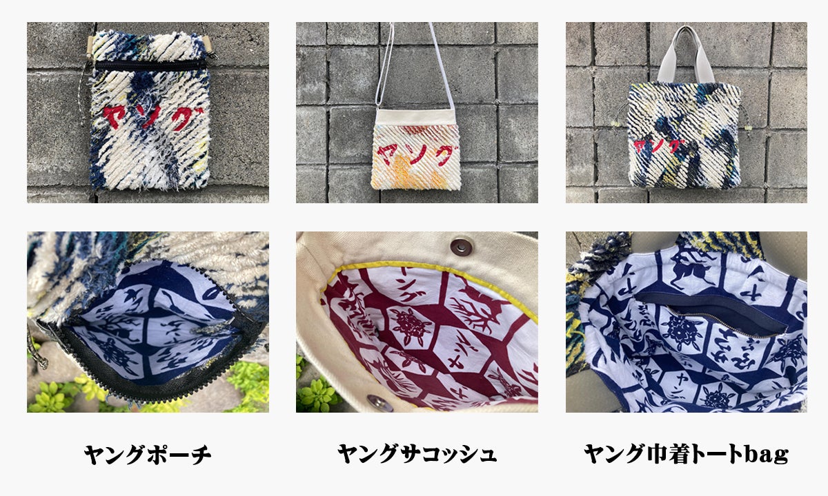 制作リターン:左から【ヤングポーチ】【ヤングサコッシュ】【ヤング巾着トートbag】15,000円〜