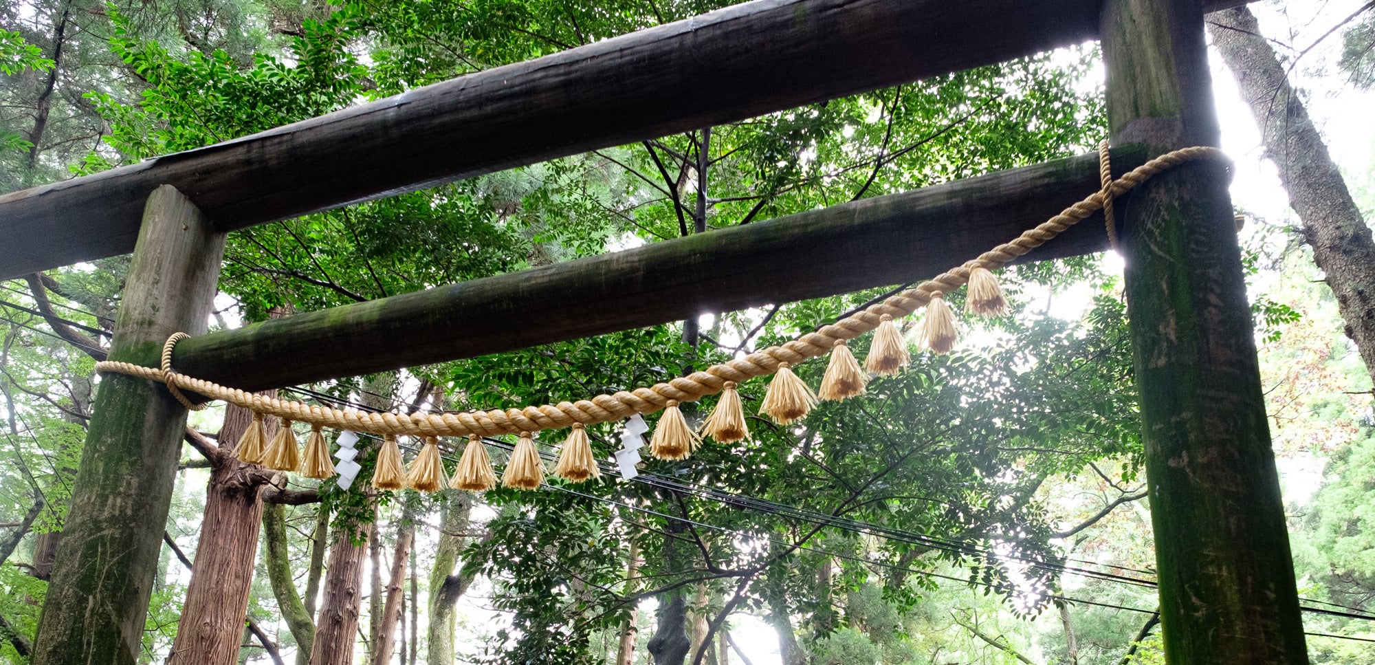 天照大御神様が二度と洞窟に戻らないようにと、布刀玉命(ふとだまのみこと)様が、しめ縄を張ったのが、しめ縄発祥の地とされている由来です。