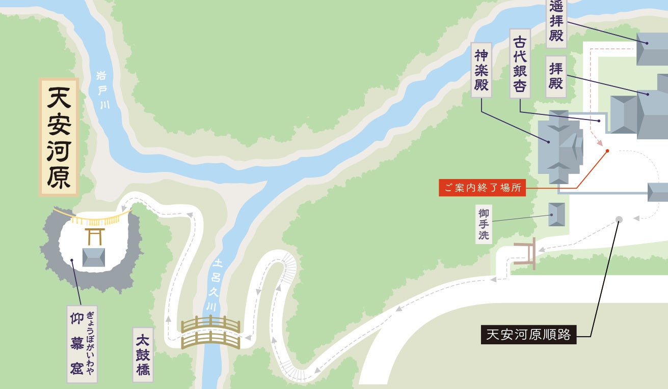 天照大御神様が天岩戸にお隠れになった際、八百万の神が集まり相談をした場所、と古事記等に記されています。河原の一角には、間口が40メートル、奥行が30メートルの洞窟があります。「仰慕窟(ぎょうぼがいわや)」と呼ばれる洞窟があります。願い事が叶うと、全国から多くの参拝者が訪れます。
