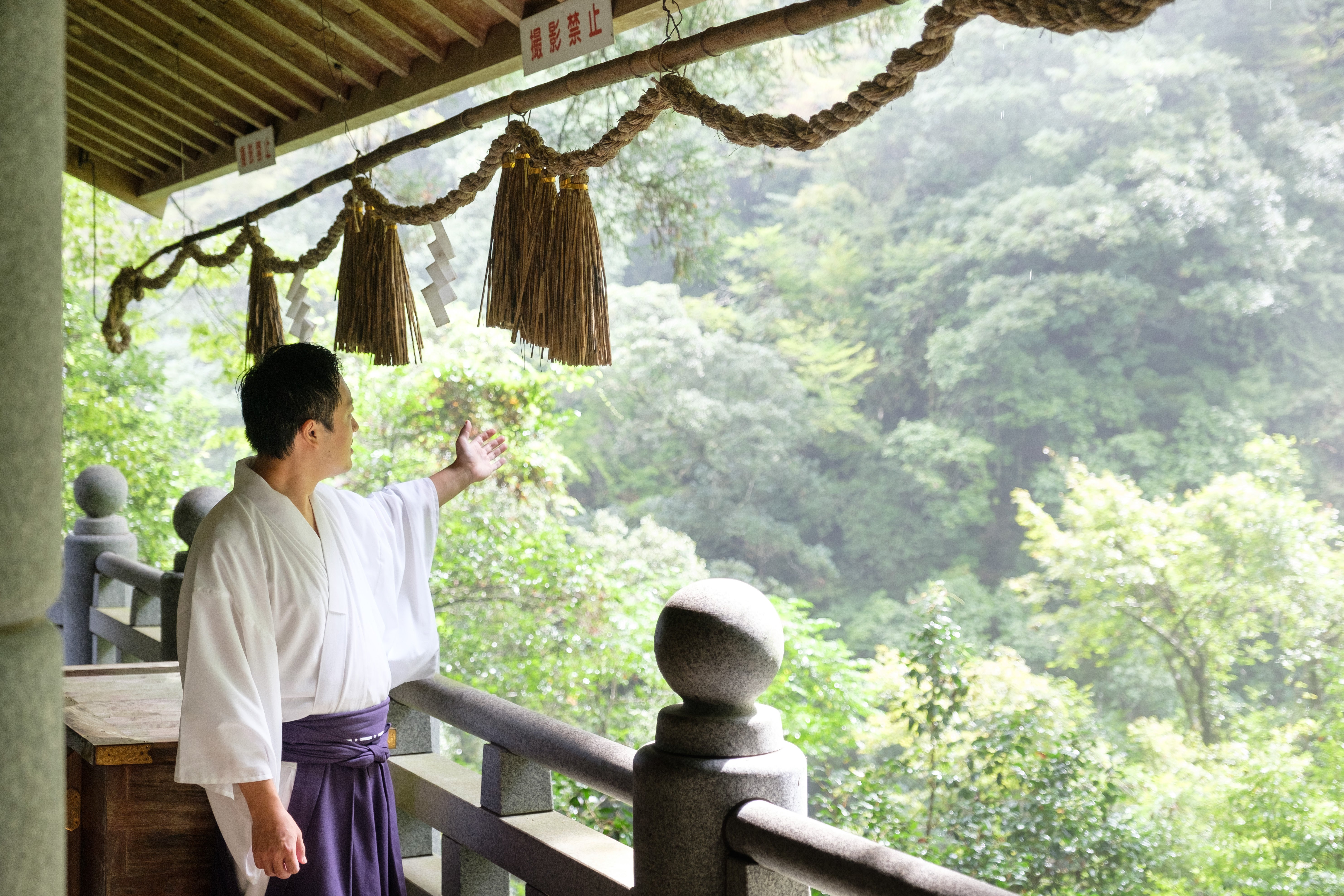 ご神体は、西本宮から川を挟んで対岸にあります。禁足地ですので足を踏み入れることはできません。うっそうとした木々に覆われ、以前は拝殿裏の遥拝殿からもはっきりとは認識できない状態でした。何度か地元の業者に相談したものの、地上50メートル、上からも70メートルの断崖絶壁の中腹で、近寄るには大きな危険が伴うため、下から登ることも上から吊り下げることもできません。しめ縄を張る方法すら見つからず、ただただ頭を抱えるばかりでした。