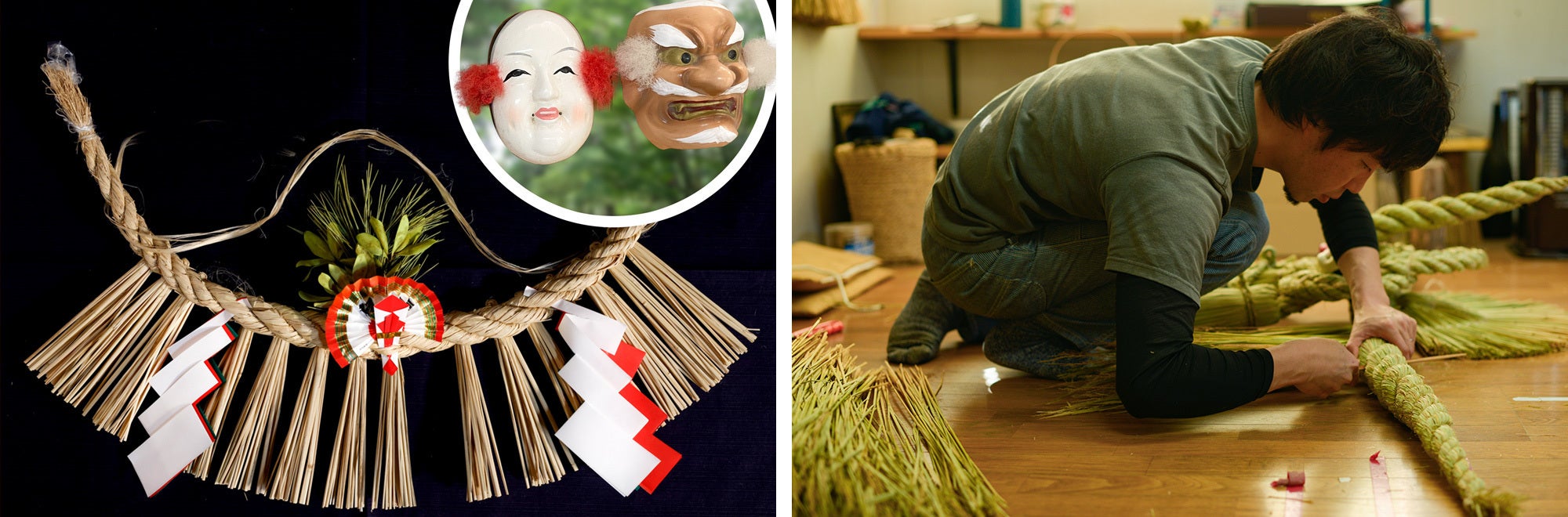 左:写真は通常のしめ縄です|右:しめ縄作りの風景
