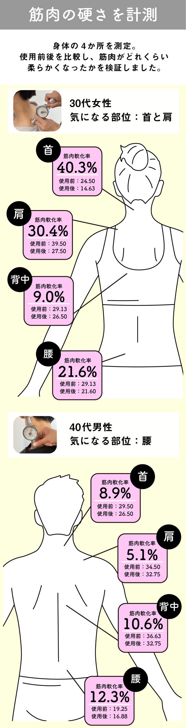 「リセットドーム」を使ったことで、計測箇所すべての筋肉が柔らかくなったことがわかりました。